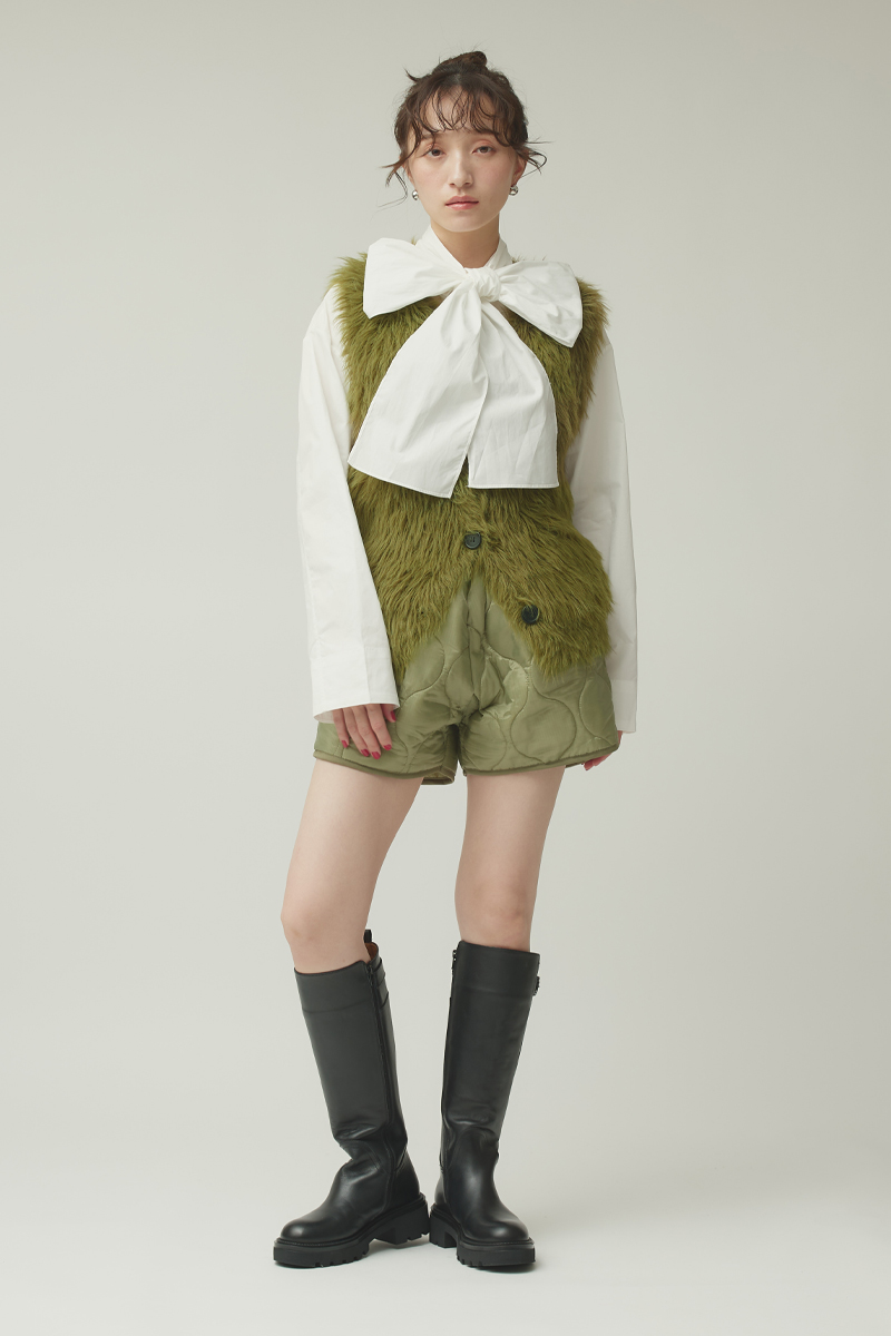 ホワイトのブラウスにカーキのシャギーベストを重ねた、コントラストが際立つスタイリング。 甘さのあるディテールとミリタリームードのカラーを掛け合わせることで、程よくエッジの効いた印象に仕上げました。 ショートボトムとロングブーツを合わせ、バランスよくモード感をプラスしています。