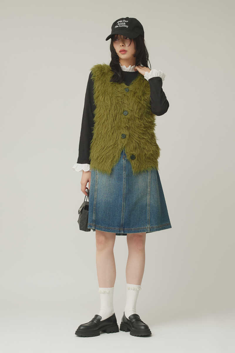 カーキのシャギーベストにデニムスカートを合わせた、こなれ感のあるカジュアルスタイル。 素材のコントラストがシンプルな着こなしに奥行きを生み、ラフになりすぎない印象に仕上げます。 小物使いで程よく力を抜き、デイリーに取り入れやすいスタイリングに。