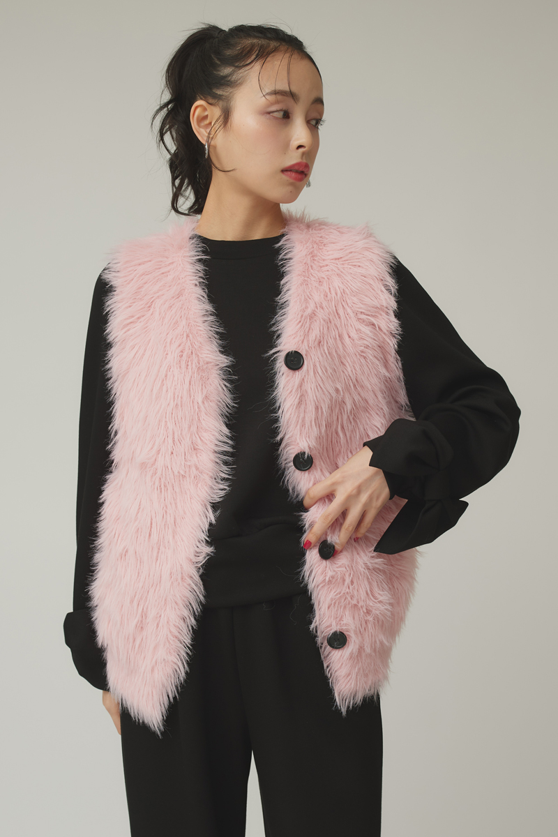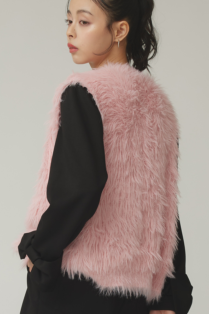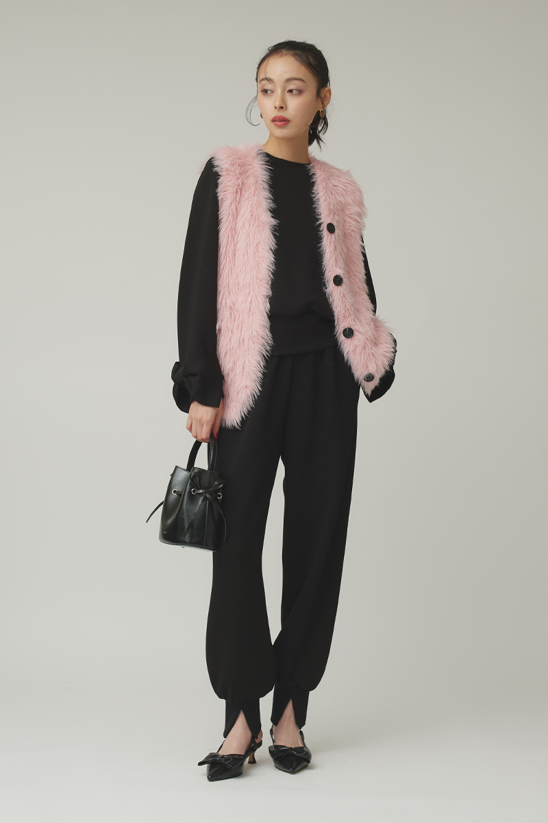 オールブラックの装いに、柔らかなピンクのベストをレイヤード。 甘さを抑えたニュアンスピンクが、スタイリングに程よいアクセントを加え、モードな雰囲気を演出します。 シャギー素材の存在感がシンプルなアイテムと好相性で、着るだけでコーディネートが完成。