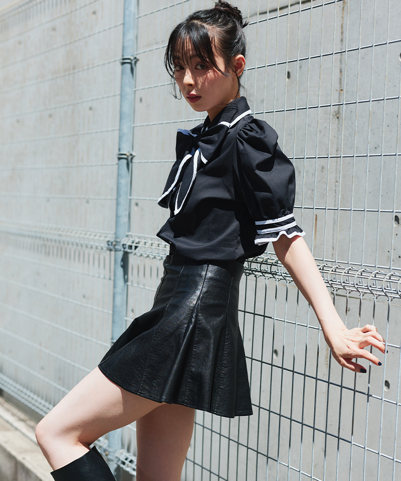 ブラックコーデも異素材や甘さのあるアイテムを組み合わせて、フェミニン×モードの上級スタイルに。リボンがアクセントのブラウスはパイピングデザインで抜け感を添え、大人っぽさと軽やかさを兼ね備えた甘辛MIXコーデが完成。