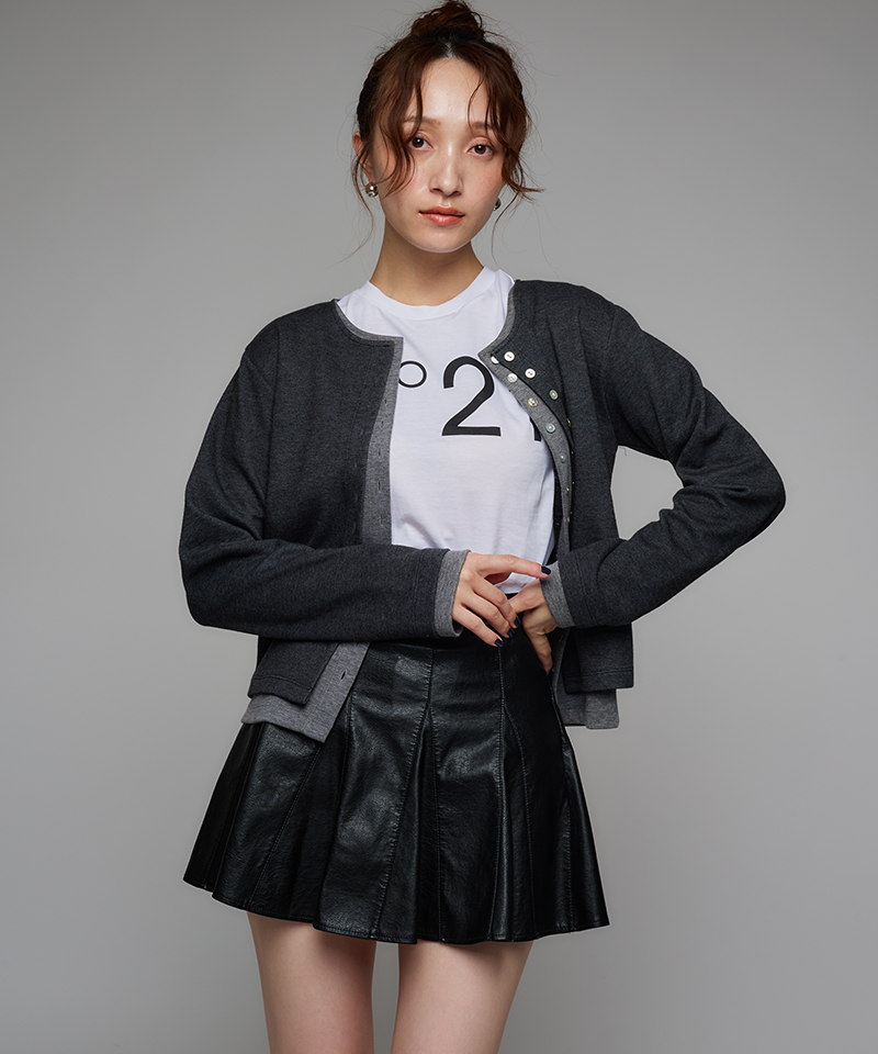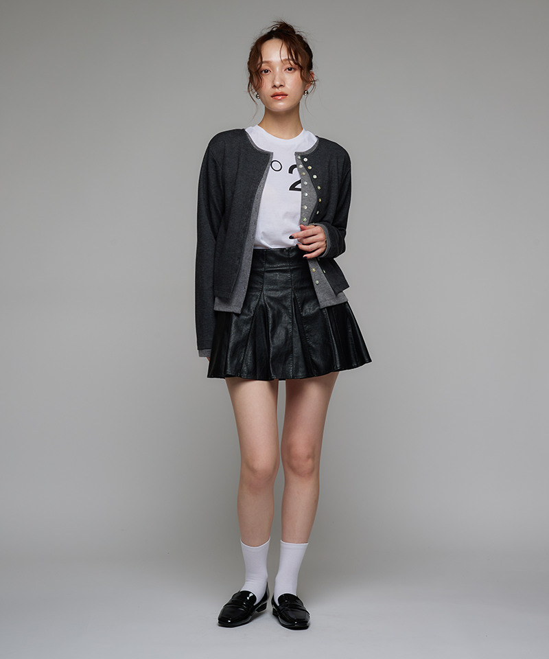フェイクレザーのフレアスカートに、プレッピーなカーディガンを合わせてトレンドライクに。インナーのTシャツで抜け感を出しつつ、ローファー×ソックスでスクールテイストをプラス。甘辛MIXに大人の遊び心を効かせた、今季注目のレディカジュアルスタイル。