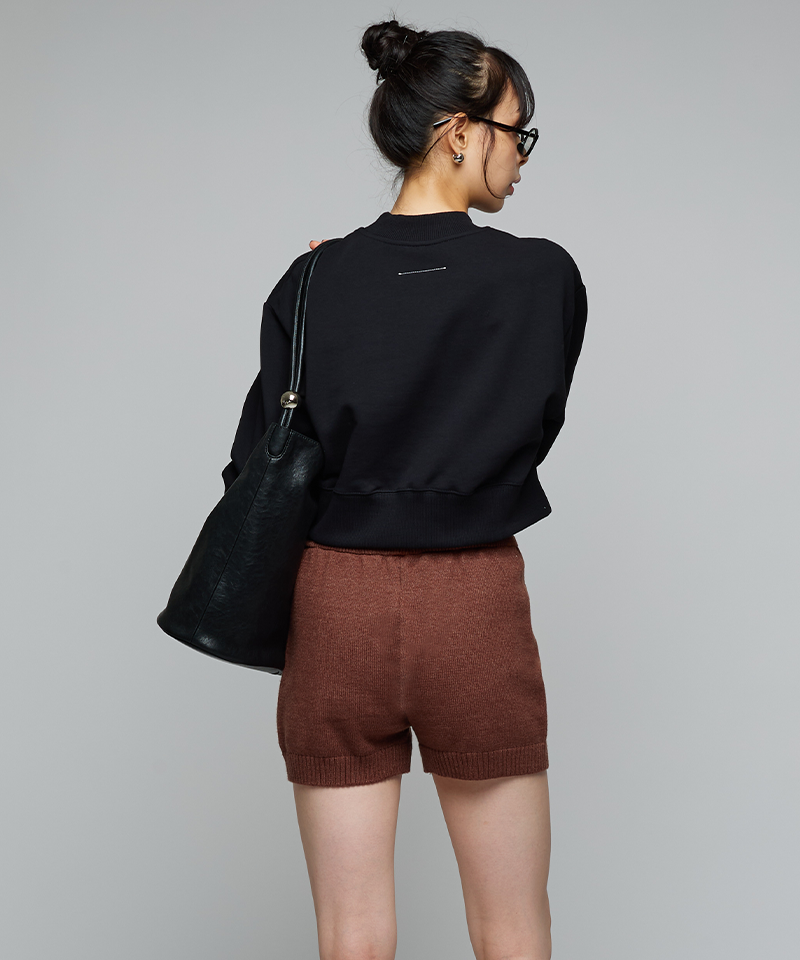 深みのあるブラウンのニットショートパンツで季節感を引き立てつつ、ショート丈のMM6刺繍スウェットでコンパクトかつ洒落感のあるバランスに。ハイソックスとバレエシューズを効かせることで、クラシカルなムードと抜け感を両立した上級カジュアルスタイル。