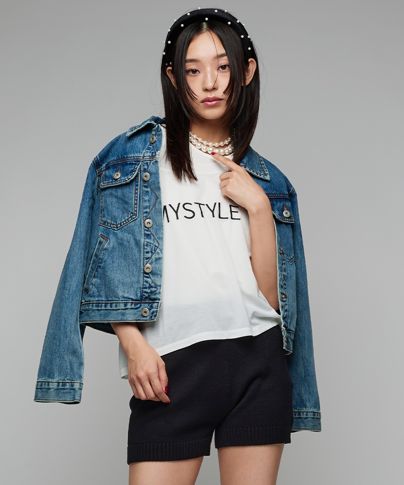 デニムジャケットをラフに羽織り、ロゴTシャツと合わせたカジュアルモードなスタイリング。シンプルながらもニットショートパンツのブラックが全体を引き締め、ロングブーツを合わせることで大人の抜け感をプラス。パールネックレスで女性らしい華やかさを添えた、旬のバランス感が光るコーディネート。