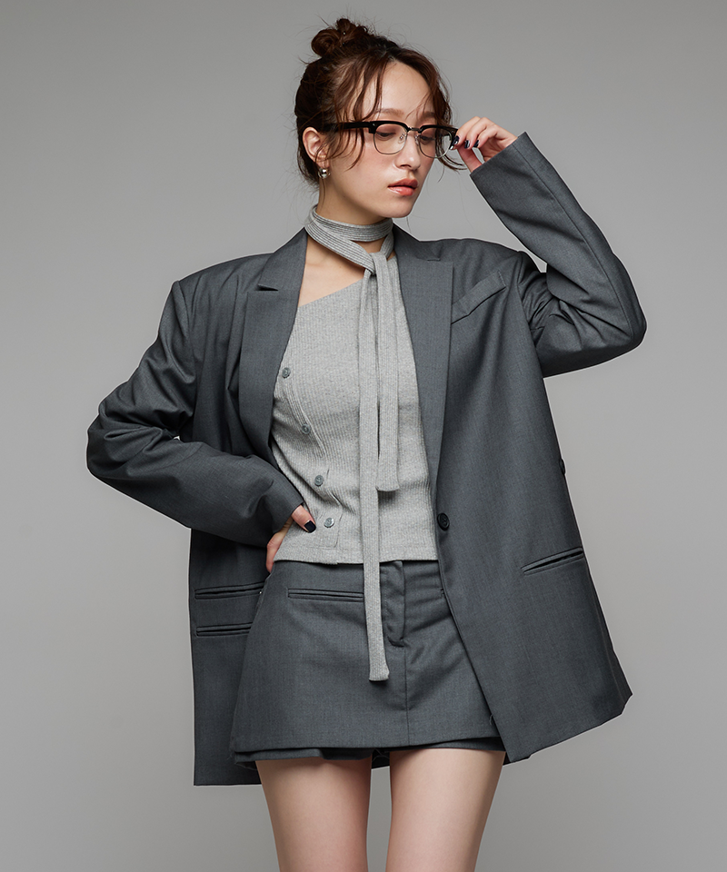 同素材のジャケットを合わせたモードなセットアップスタイル。ミニ丈のドッキングスカートで程よい抜け感をプラスし、グレーのワントーンでまとめることで都会的で洗練された印象に。小物で遊びを効かせれば、デイリーにも特別なシーンにも映える大人のスタイリングが完成。