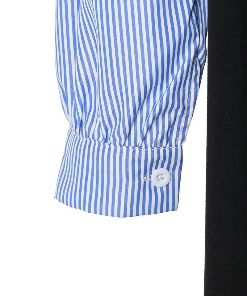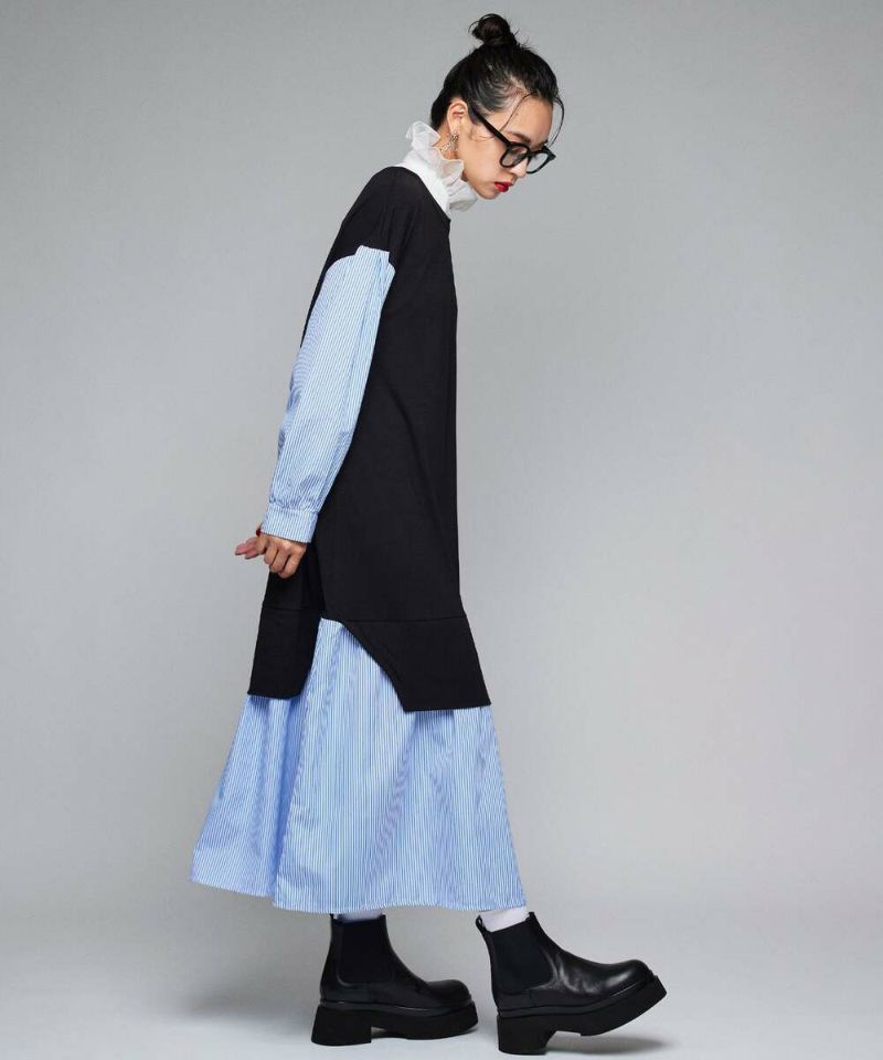 異素材をドッキングしたシャツワンピース。薄手で着心地と風通しの良い素材感なので、ロングシーズン着用できるのが嬉しいポイント。1枚でカジュアルにもフェミニンにも仕上がる、こなれ感のあるドッキングデザイン。【model】H163 B78 H84