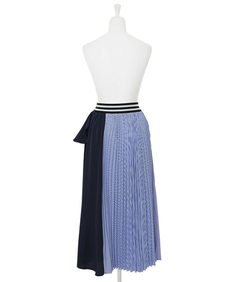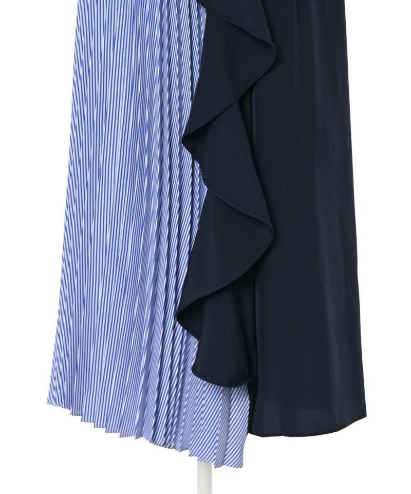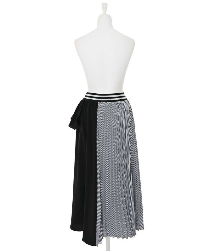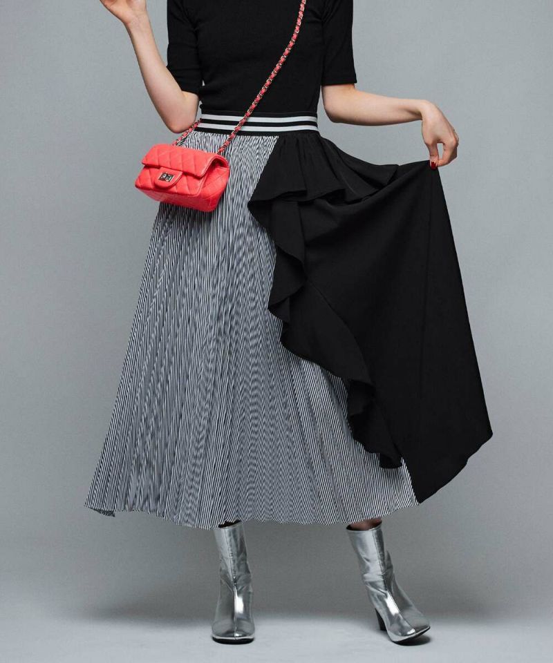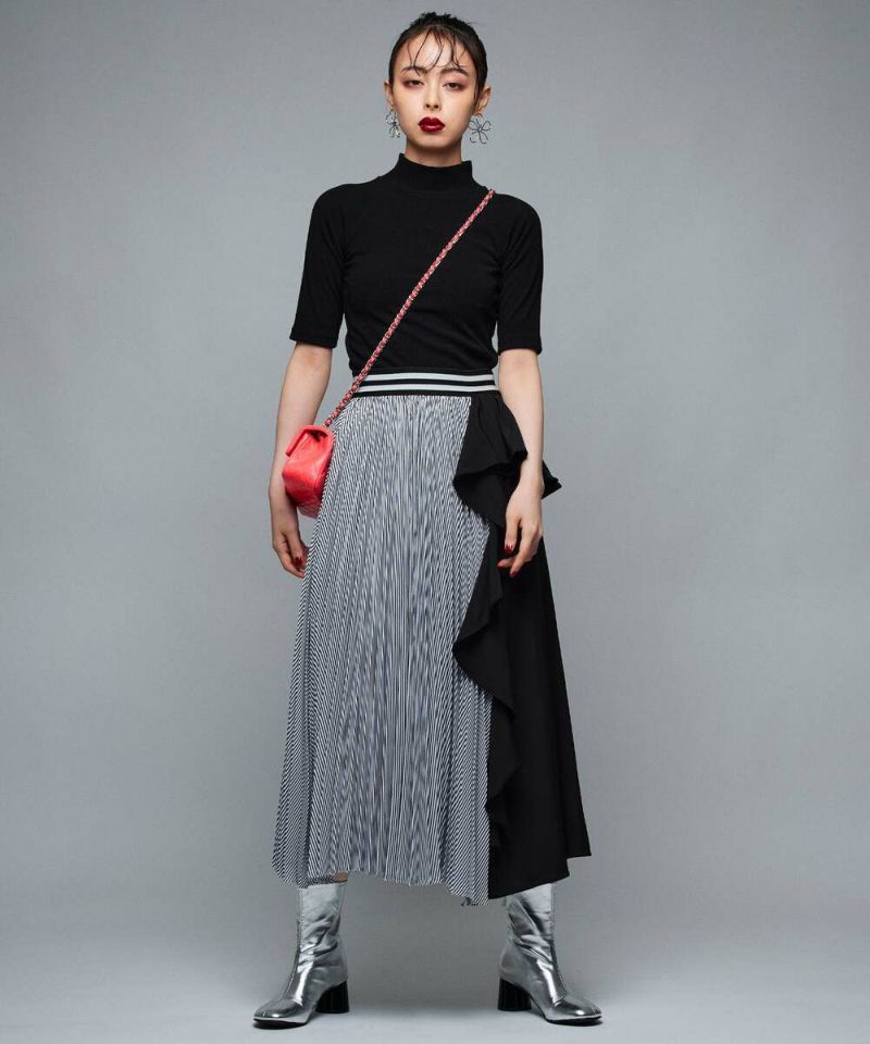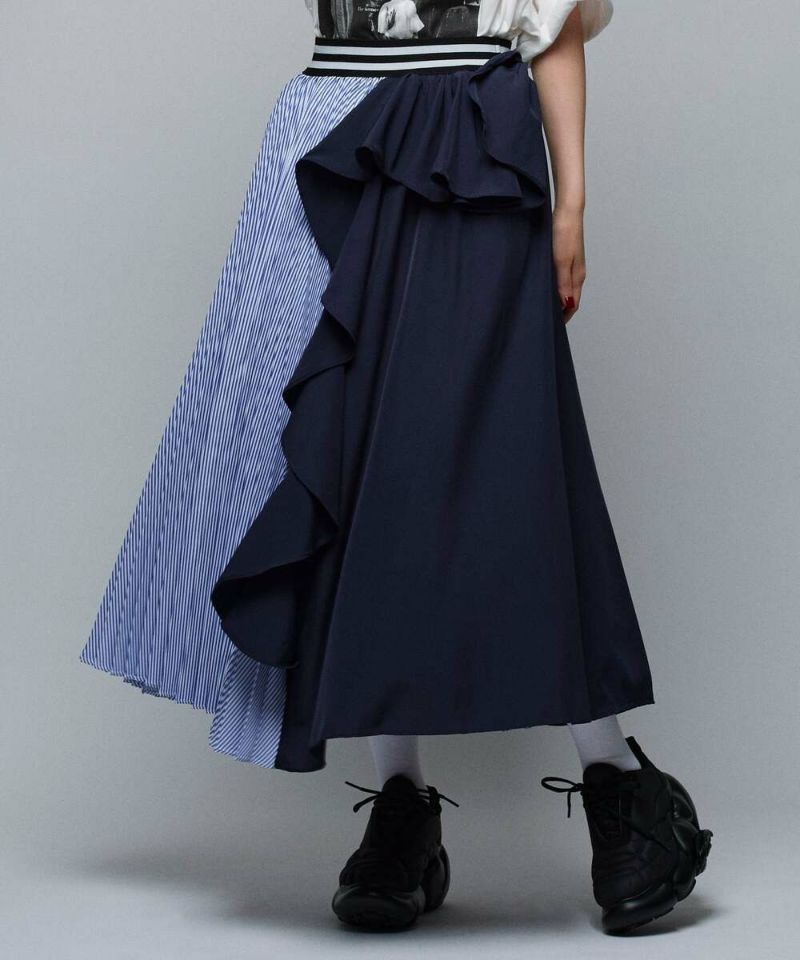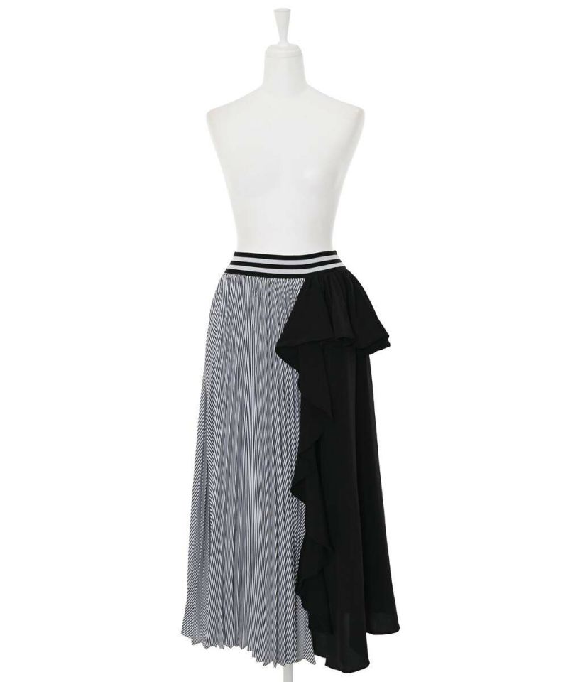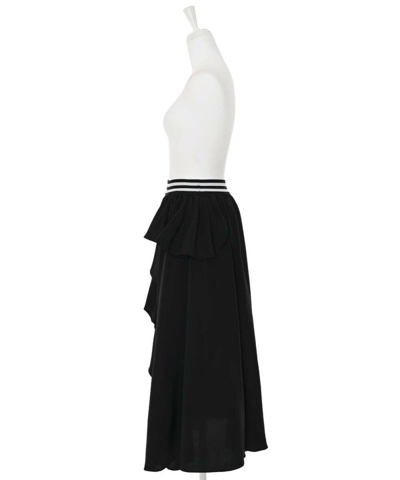 フリル&プリーツ加工のアシンメトリーデザインが目を惹き、スタイリングを華やかにしてくれるロングスカート。ベーシックなトップスと合わせるだけで、お洒落度アップ。ストレスフリーに着用できるウエストゴムを採用。【model】H165 B78 H83