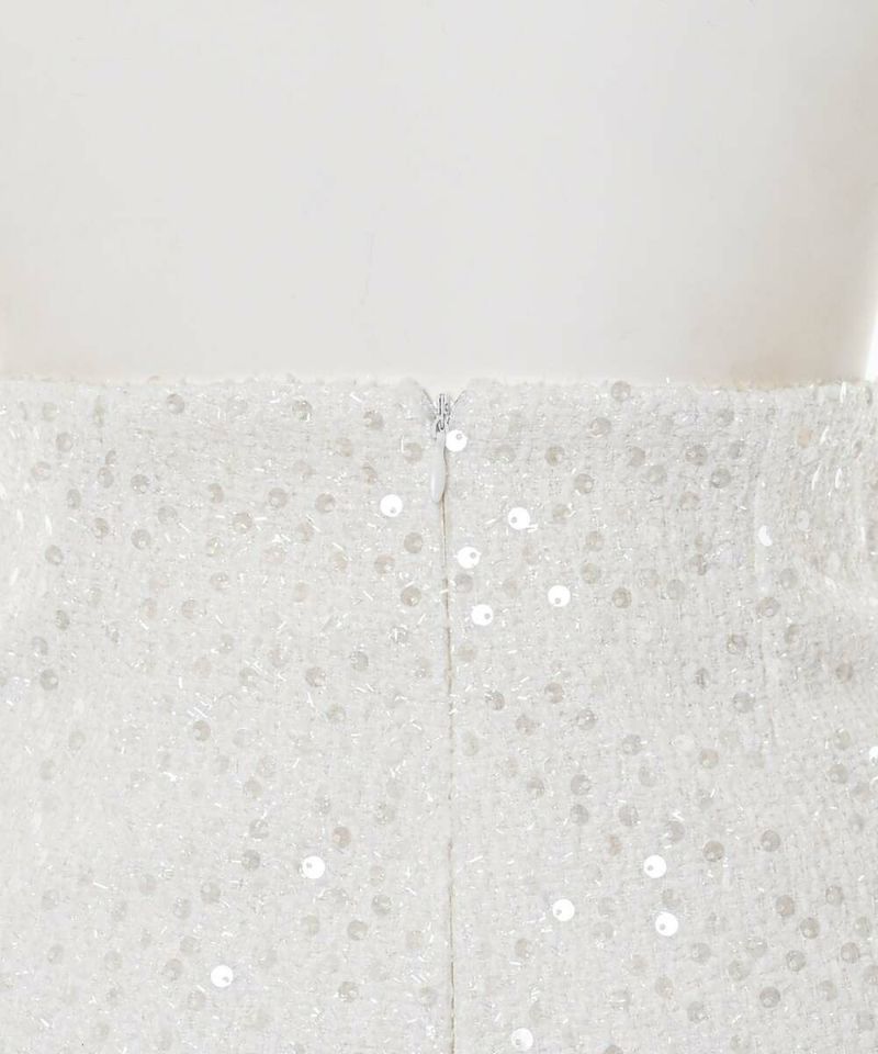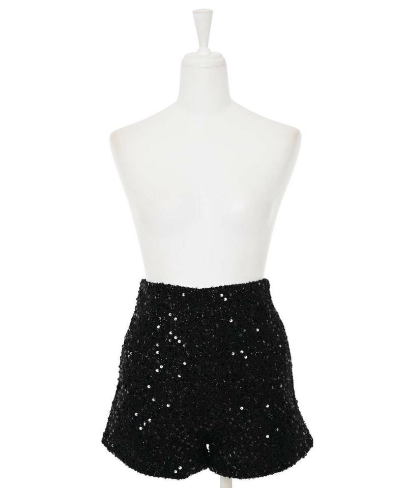 ツイード生地にスパンコールが散りばめられたシーズンムードを高めるショートパンツ。アウトスタイルで着用し、トップスからチラ見せさせるのもオススメ。カジュアルにも、綺麗めにもなる万能アイテム。【model】H163 B78 H84