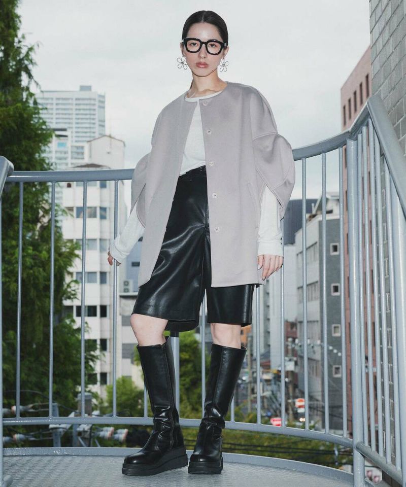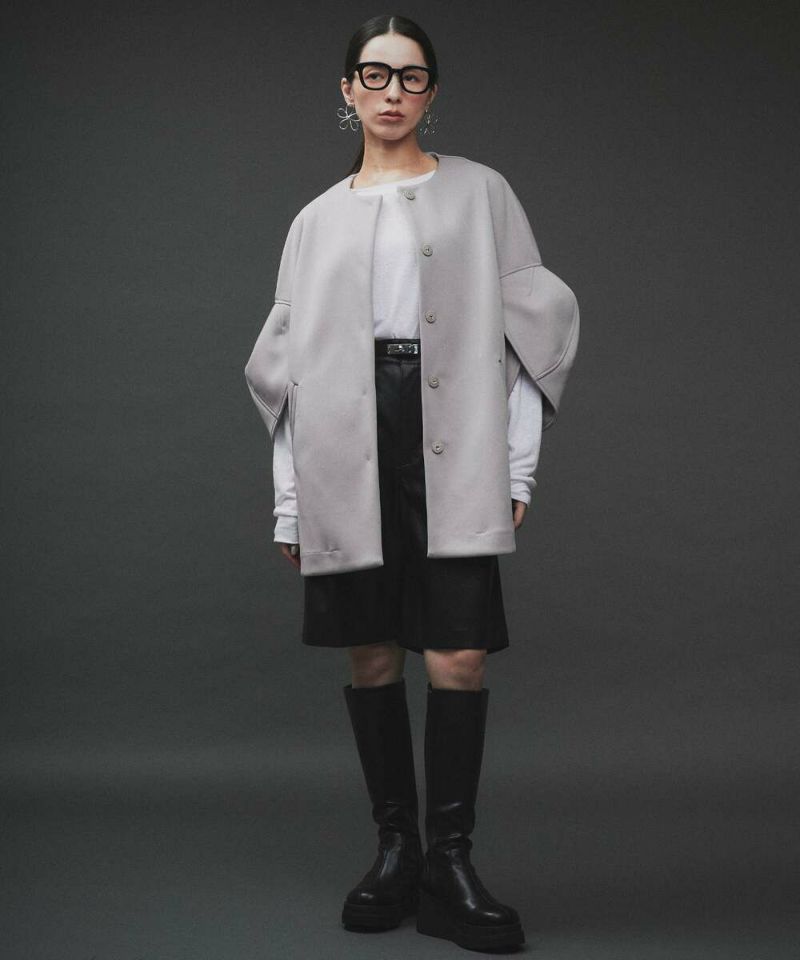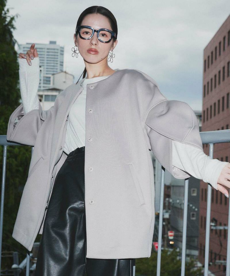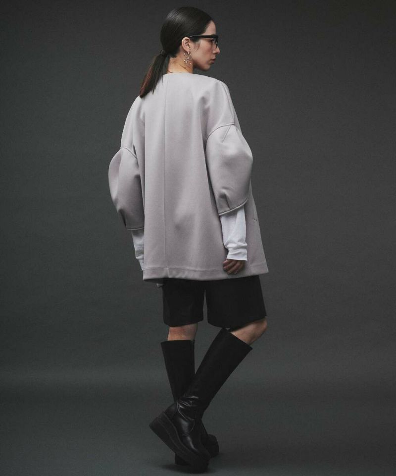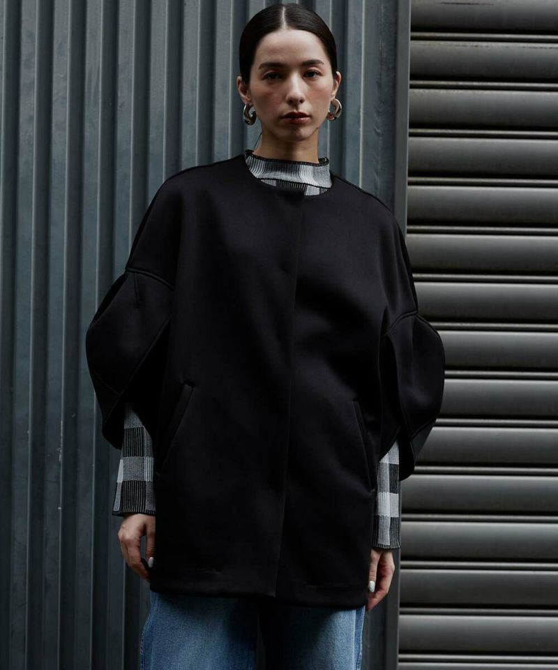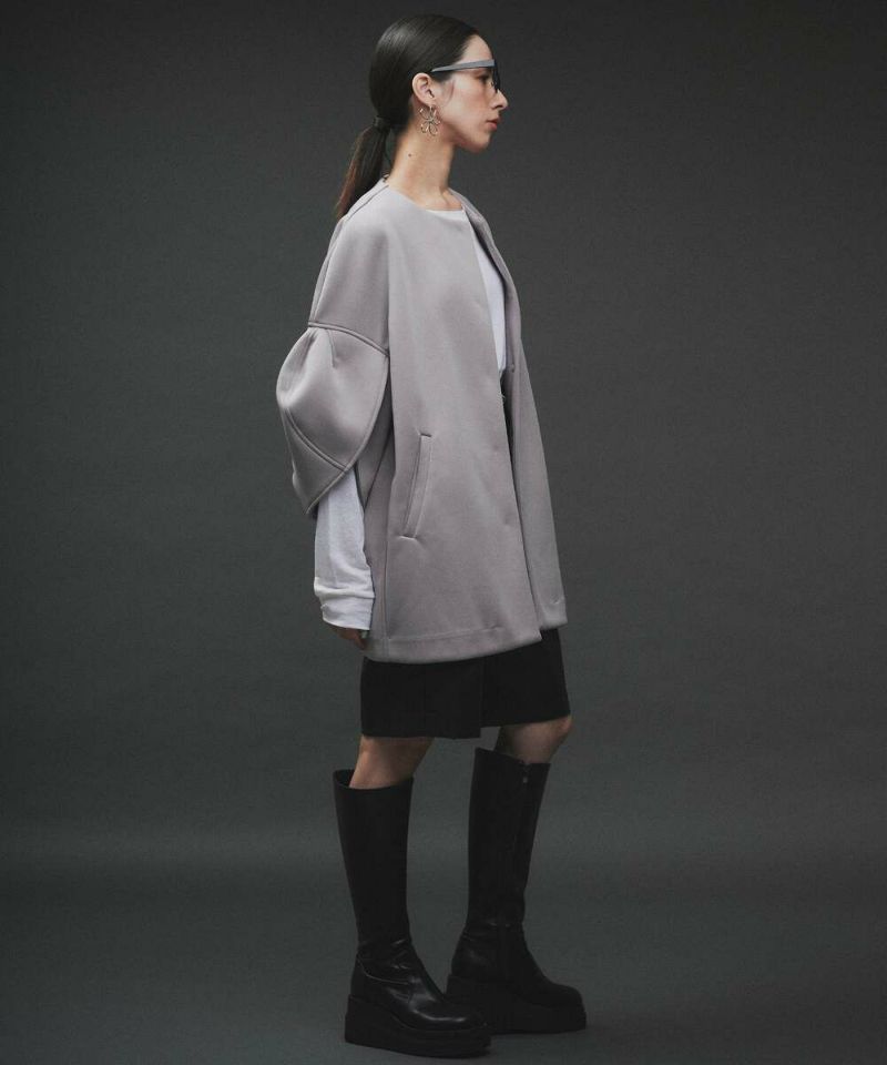 ノーカラーデザインとハリ感のあるボンディング素材が、綺麗めな印象のライトコート。ボリュームのあるお袖に、身頃はスッキリとしたデザインを採用することで、メリハリのあるシルエットに仕上げました。インナーを選ばずに羽織れる、ゆとりのあるサイジングもポイント。レイヤードスタイルを楽しめる七分袖を採用し、軽量で持ち運びしやすいので、気温差のある時期にも活躍するアウターとなっております。両サイドには、深めのポケット付きで機能性も抜群◎デイリー使いにはもちろん、フォーマルシーンにもピッタリで重宝するアイテムです。