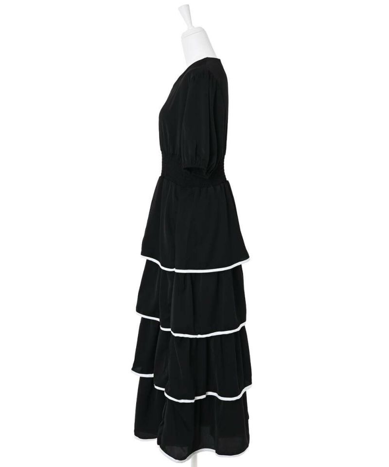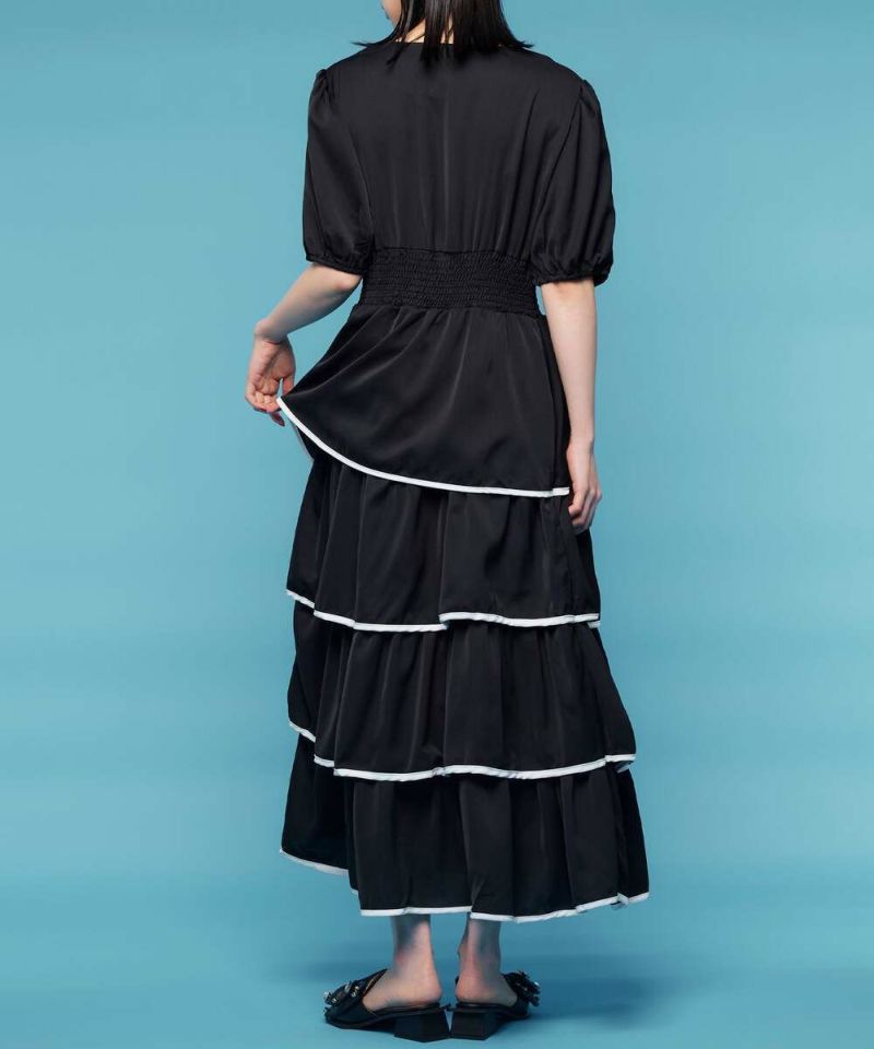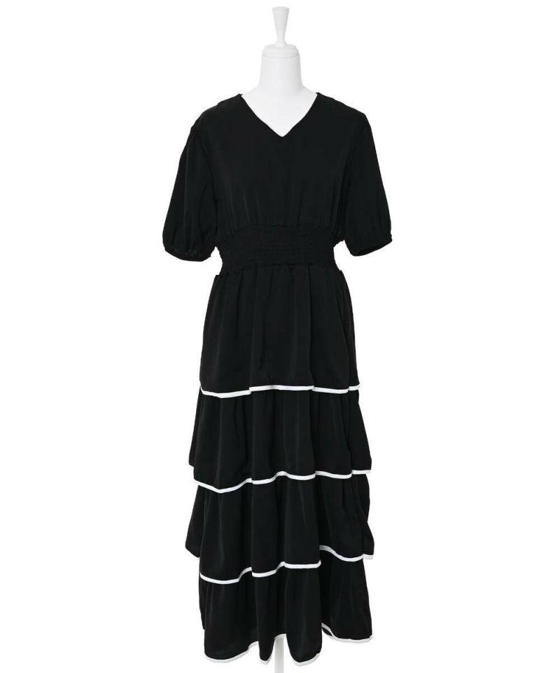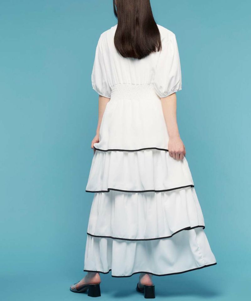1枚で決まるカンカンワンピース。フリル部分にバイカラーでパイピング加工がされていることで、フェミニンな印象をプラス。パフスリーブとVネックが抜け感を。ウエストはゴムなのでストレスフリーに着用できます。モデル身長:156cm/165cm