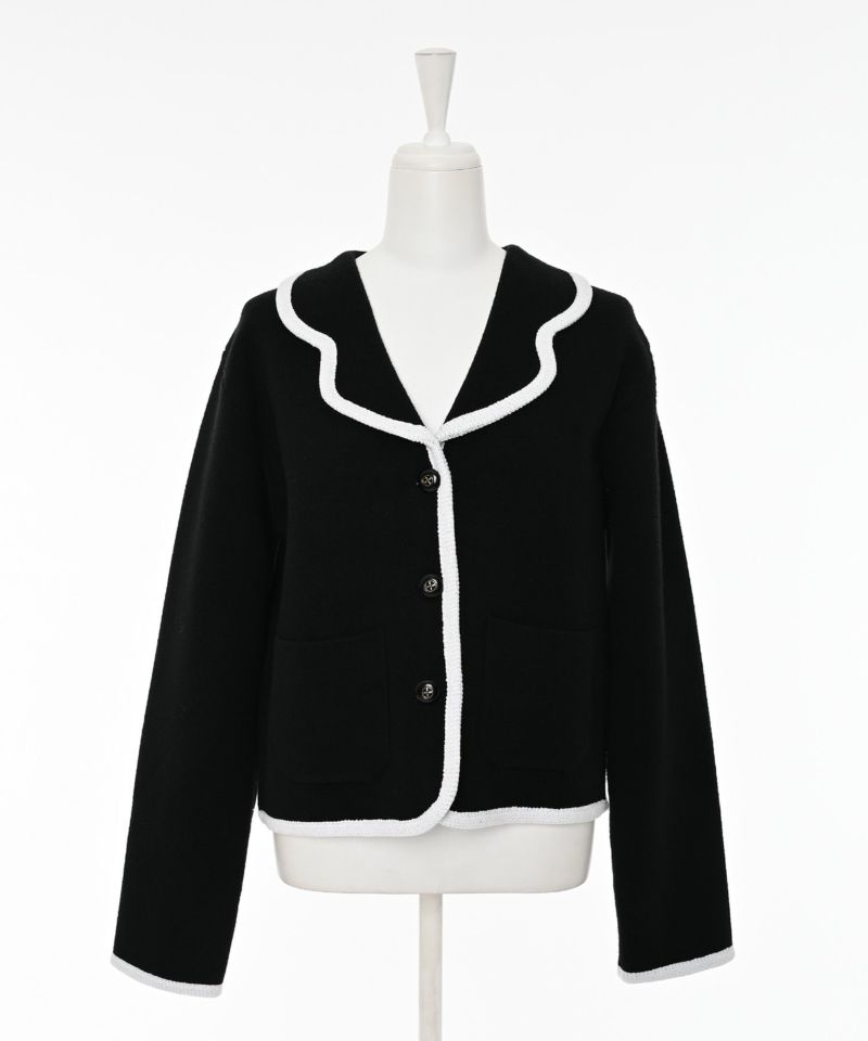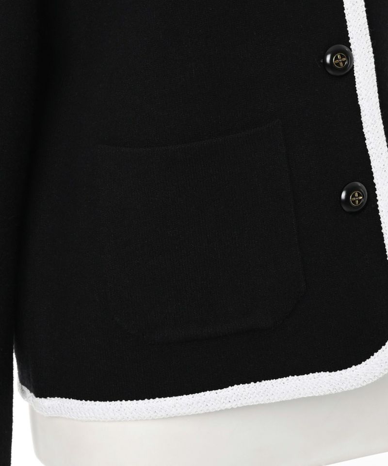 配色ラインと大きめの襟が目を惹くクラシカルなニットジャケット。コンパクトな丈感と華やかなボタン使いで、上品さとトレンド感を兼ね備えた一枚です。