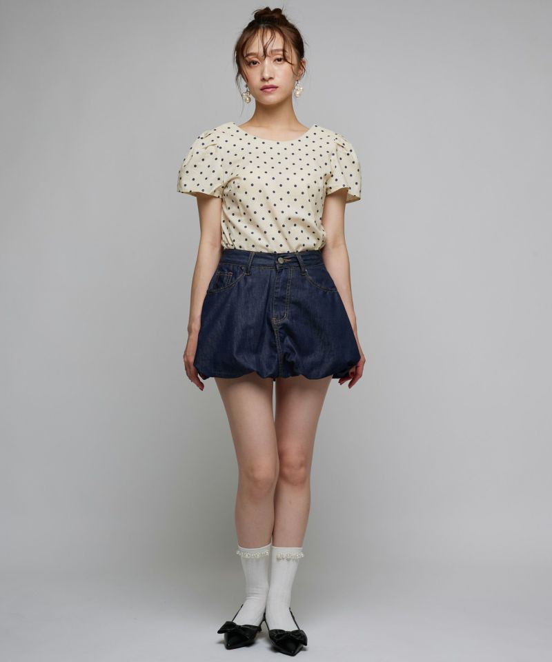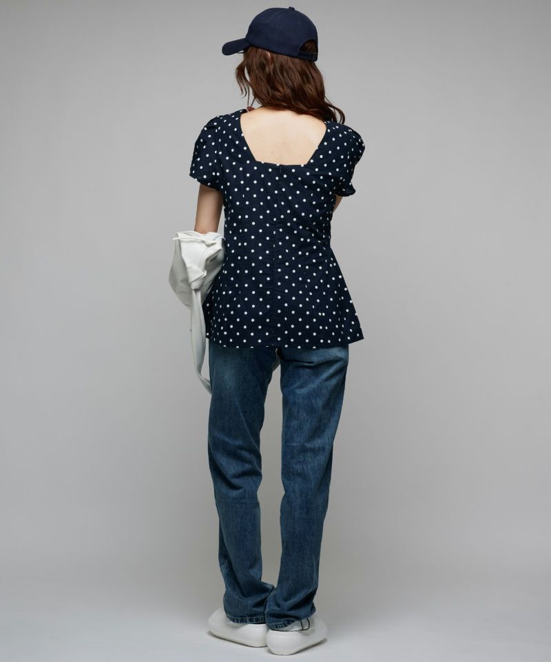 レトロな雰囲気のドット柄を全体に使用したパフトップス。さりげないペプラムシルエットがくびれを強調してくれ、スタイルアップ効果に。パフスリーブと肌見せのバックスタイルが女性らしさをプラス。リネン素材を使用していることで、風通しと着心地の良さ◎着脱しやすいジップアップを採用。