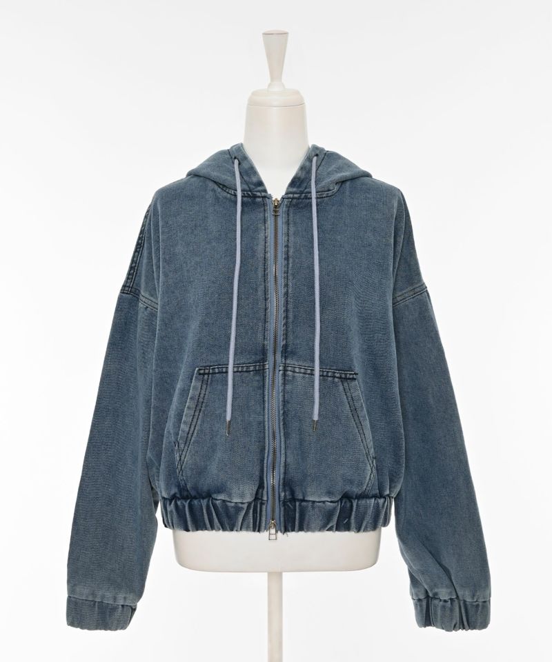 デニム素材で仕立てたジップアップパーカー。ドロップショルダーのゆったりとした袖と、裾に施されたギャザーが生み出す丸みのあるシルエットが魅力です。ショート丈のバランスが全体をコンパクトにまとめ、スタイルアップ効果を演出。フードとフロントジップのディテールがカジュアルな表情を添えつつ、ラフ過ぎない洗練された印象に。