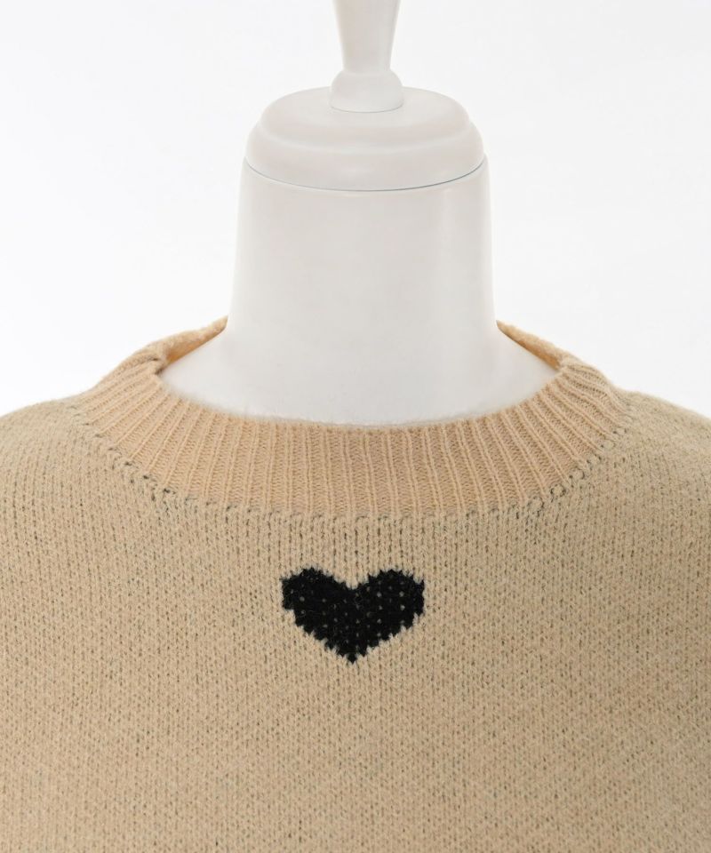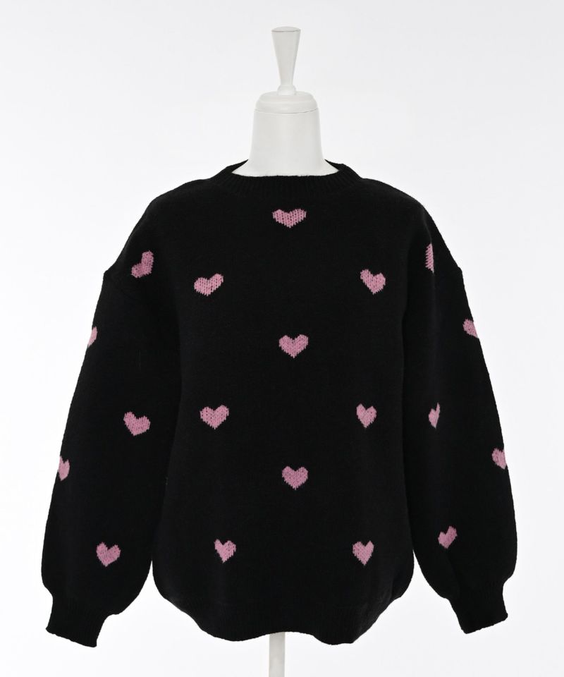 ニット全体に散りばめられたハート柄が目を惹くデザイン。遊び心のあるモチーフながらも、カラーを抑えることで大人っぽく着こなせる一枚です。シーズンスタイルを華やかに彩る主役ニットです。