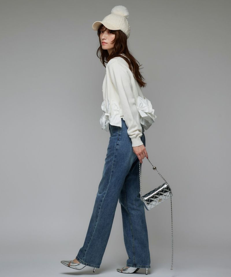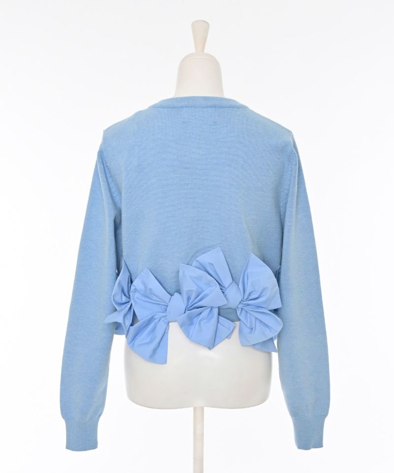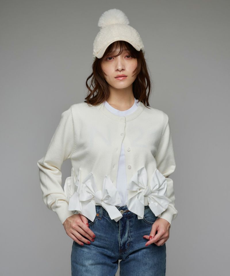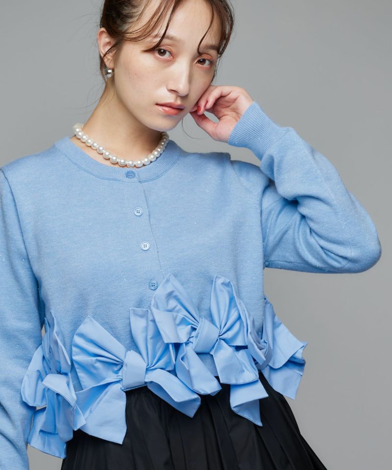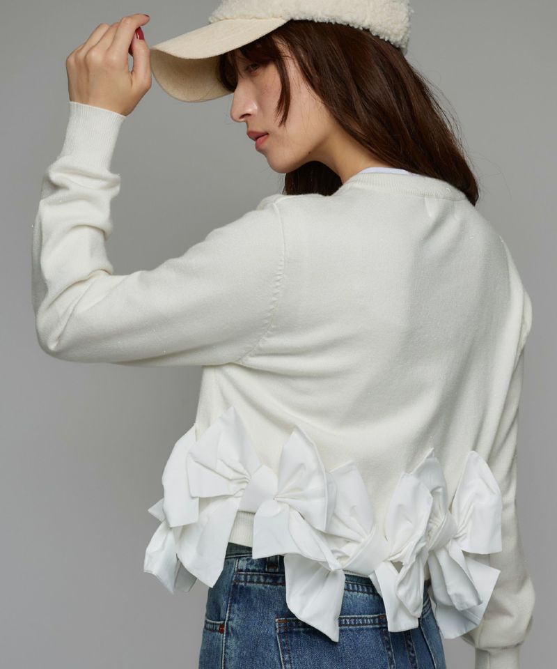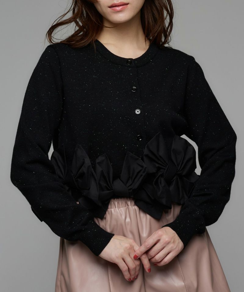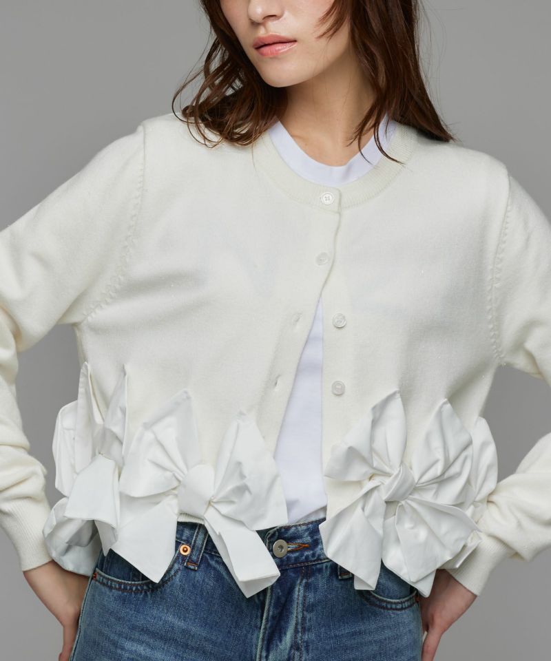 裾にあしらわれたリボンが印象的な、女性らしいシルエットのカーディガン。リボンのディテールがそのままデザインの主役となり、フェミニンな雰囲気を際立たせます。