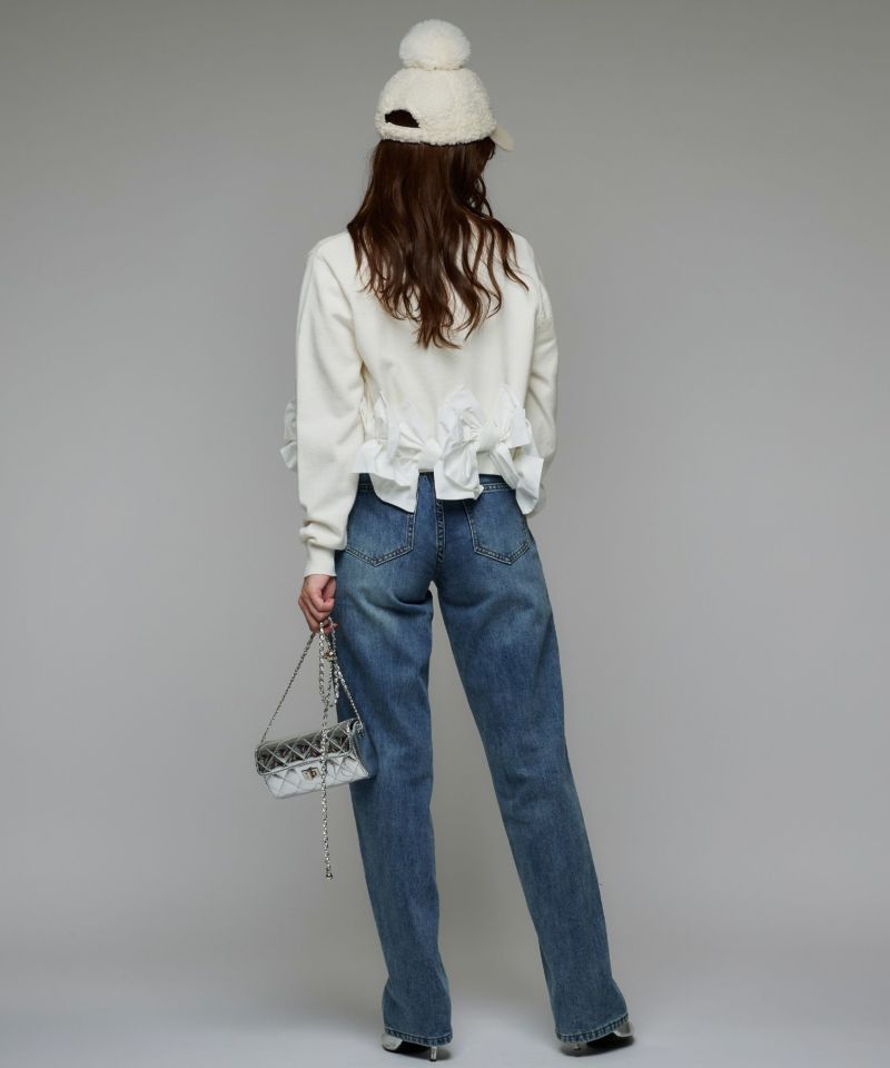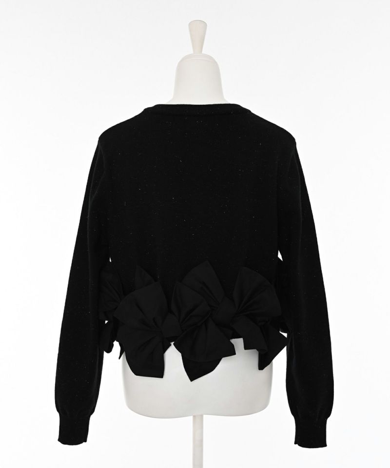 柔らかく肌触りの良いニット素材。程よい厚みと伸縮性があり、身体に優しく沿う着心地で暖かさ◎異素材でリボンが7つ施されていますが、着用時には気にならない重量です。
