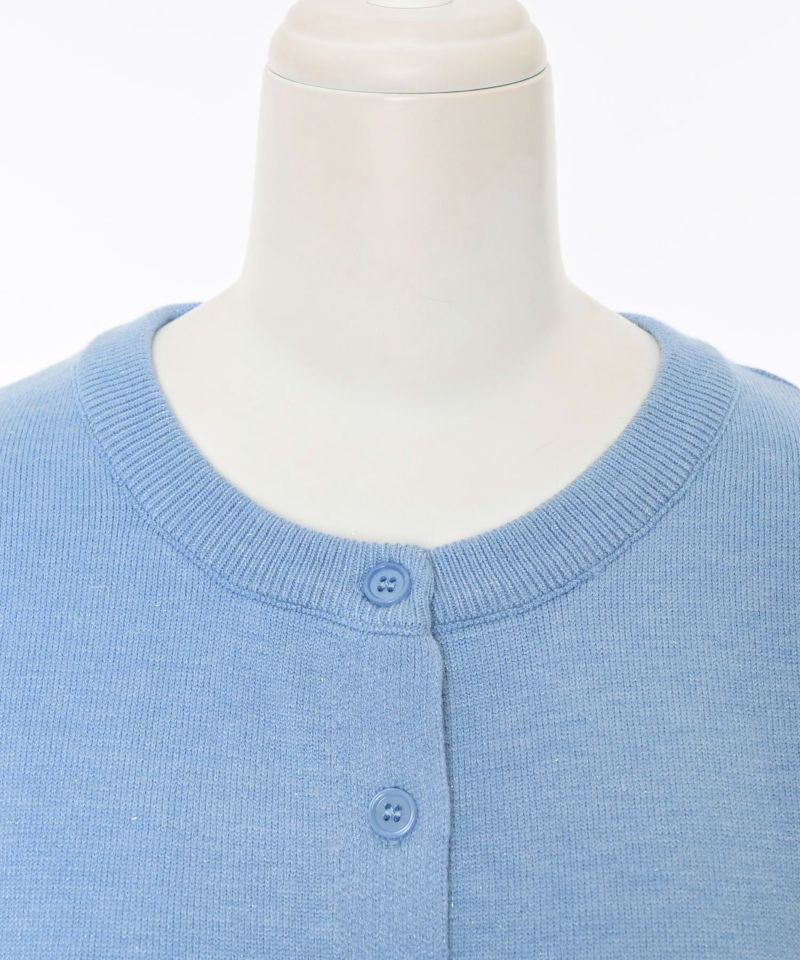 若干ゆとりのある身幅とラウンドネックが、柔らかく女性らしい印象を生むカーディガン。裾にあしらわれたリボンディテールが動きに合わせて表情を変え、光沢のある繊維が織り込まれた生地が上品で立体的なシルエットを際立たせます。ボタンの開閉でトップスとしてはもちろん、カーディガンとしても着用可能。リボンは縫い付けられているデザインになっているので、解ける心配はございません。