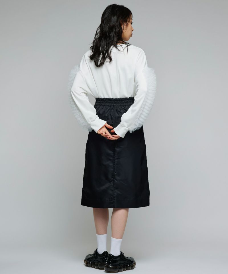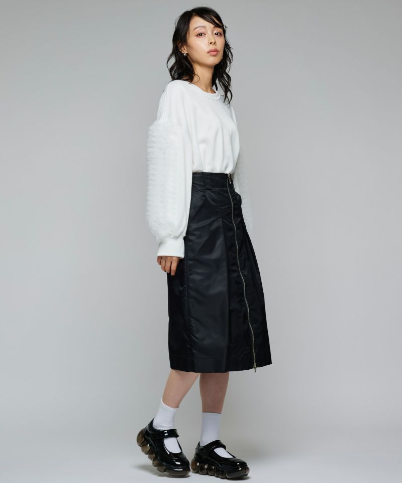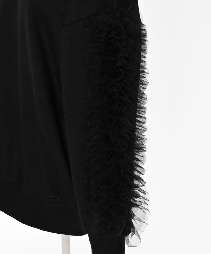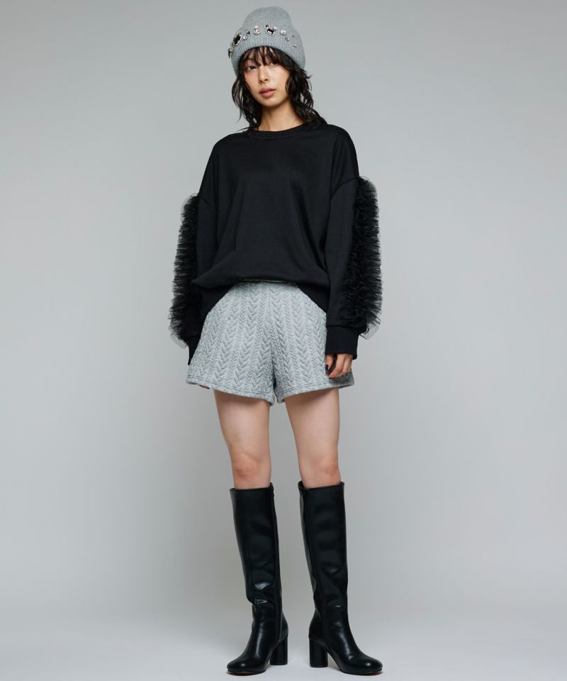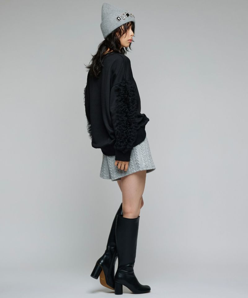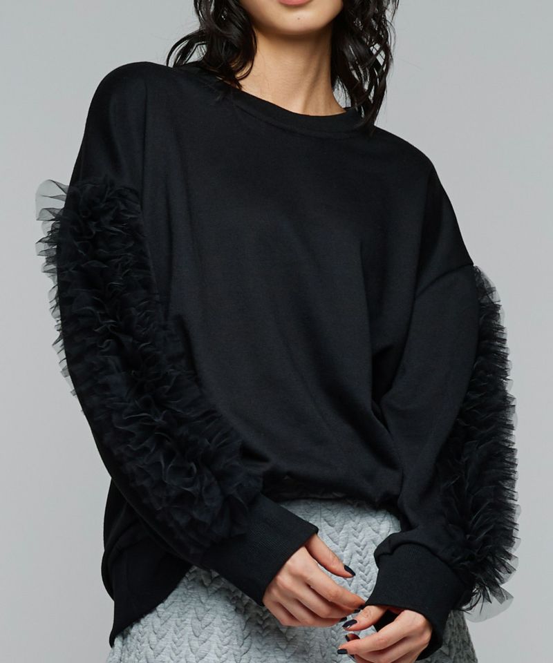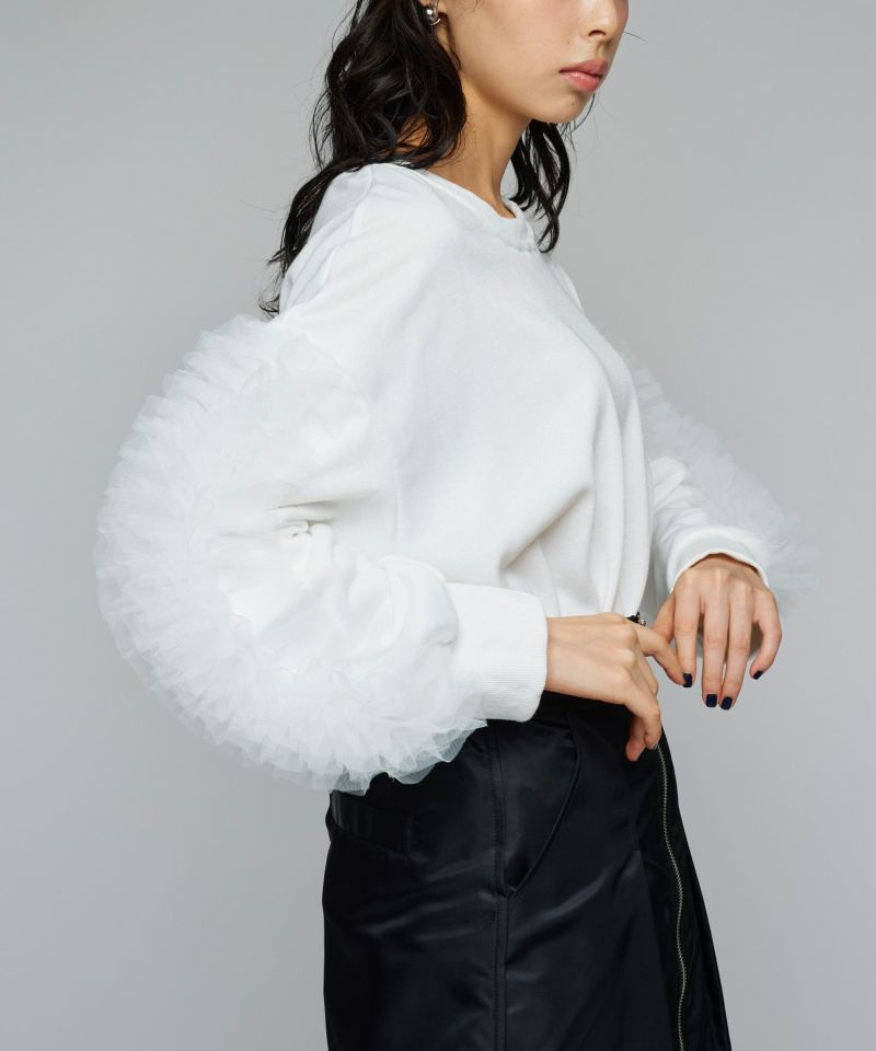 シンプルなスウェットに裾フリルをドッキングしたトップス。程よい甘さを添えつつ、洗練されたカジュアルスタイルを演出します。一枚でさりげなく存在感を放つ、大人のデイリースタイルにぴったりの一着です。