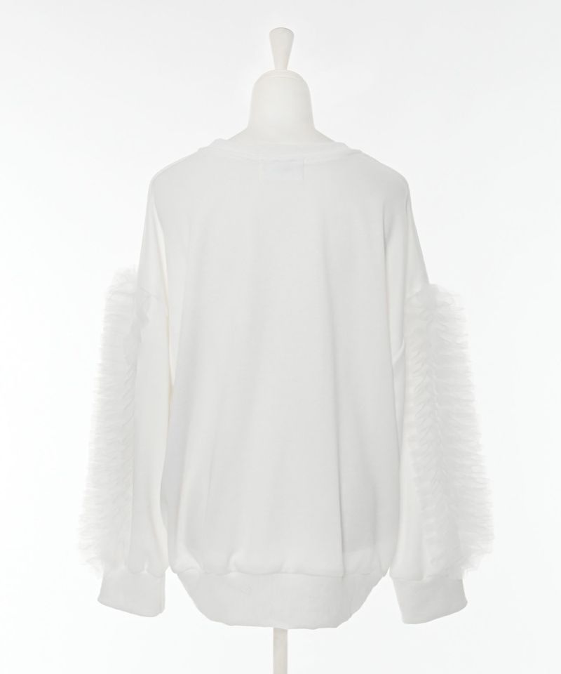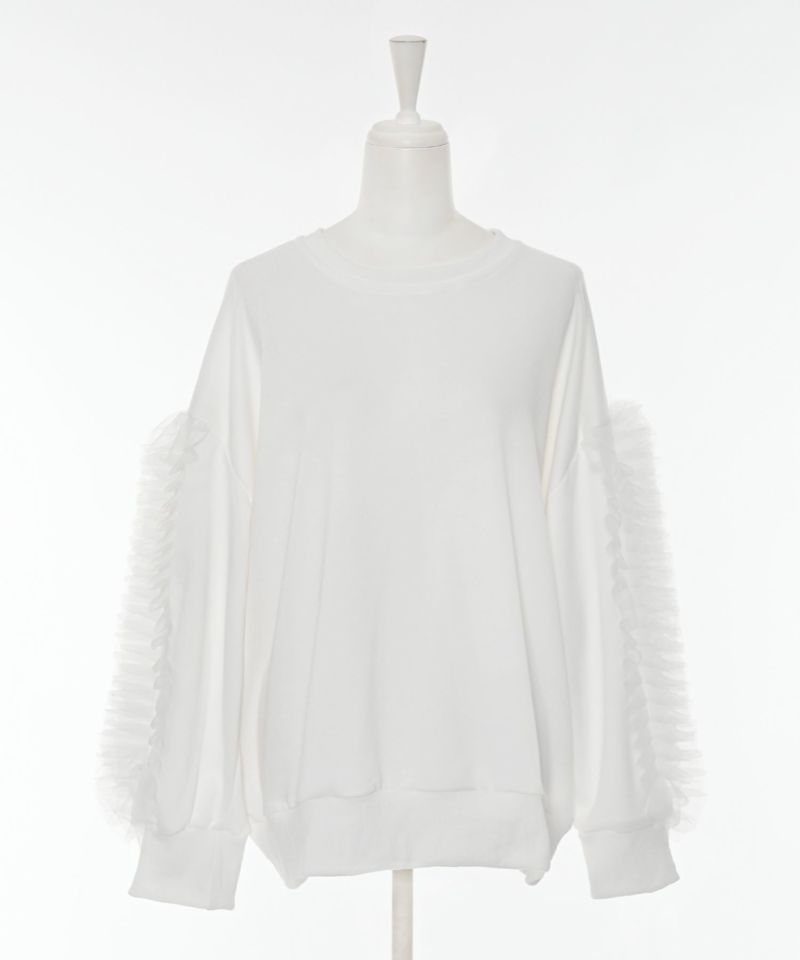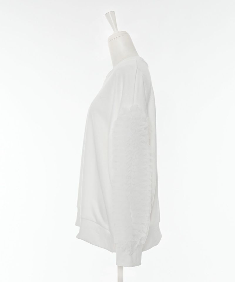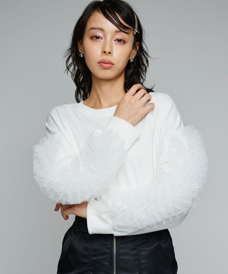 シンプルながらも袖に施されたフリルが、さりげなくフェミニンな印象を添えるスウェット。肩のラインを落としたリラックスシルエットと、ゆったりとしたサイズ感が抜け感のある着こなしを叶えます。身体のラインを拾わず、自然とこなれた雰囲気を演出できるのも魅力。カジュアルすぎない程よい上品さがあり、デニムやスカートなど合わせるアイテム次第で表情が変化します。一枚で主役としても、レイヤードのアクセントとしても活躍する万能な一着です。