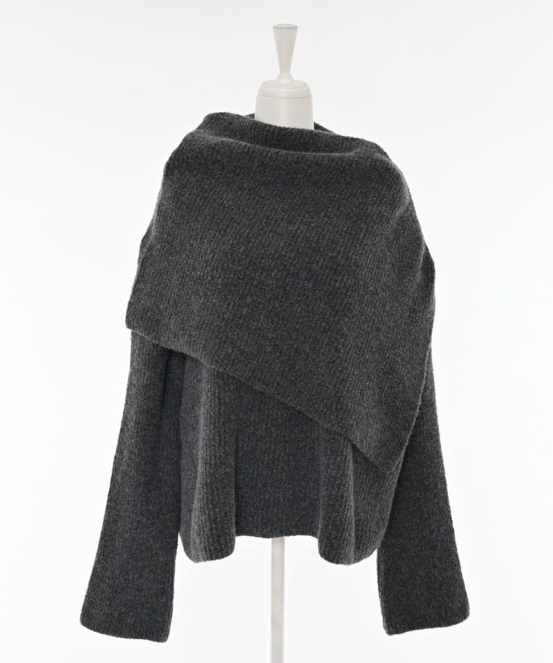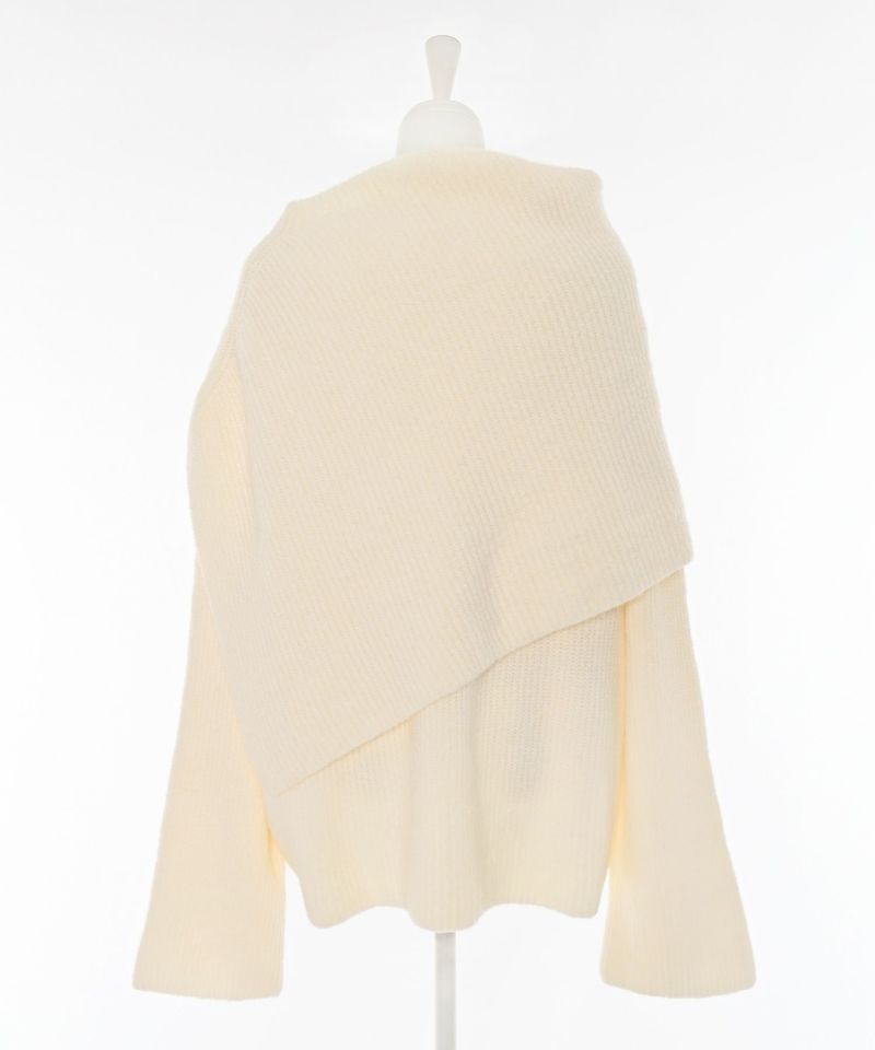 ボートネックのベーシックなニットトップスと同素材のケープがセットになったアイテム。左に深めのスリットが入っているケープは、機能性とお洒落さを融合させたアシンメトリーデザインになっています。個性がありながらも単色ベースで着回し力の高さを兼ね備えているのがポイント。