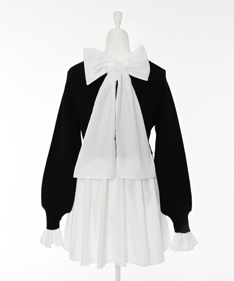 ペプラムシャツとニットトップスがドッキングしたデザインで、一枚で洗練されたレイヤードスタイルが完成します。リボンタイは前でも後ろでも結べる仕様で、アレンジ次第で印象を変えられるのが魅力。ニットの切り替え位置が高めに設定されているため、自然にスタイルアップが叶います。腰から下はペプラムデザインになっており、腰回りをさりげなくカバーしつつ女性らしいシルエットを演出。デイリーからお出かけまで幅広く活躍する、一枚でこなれ感を楽しめるアイテムです。