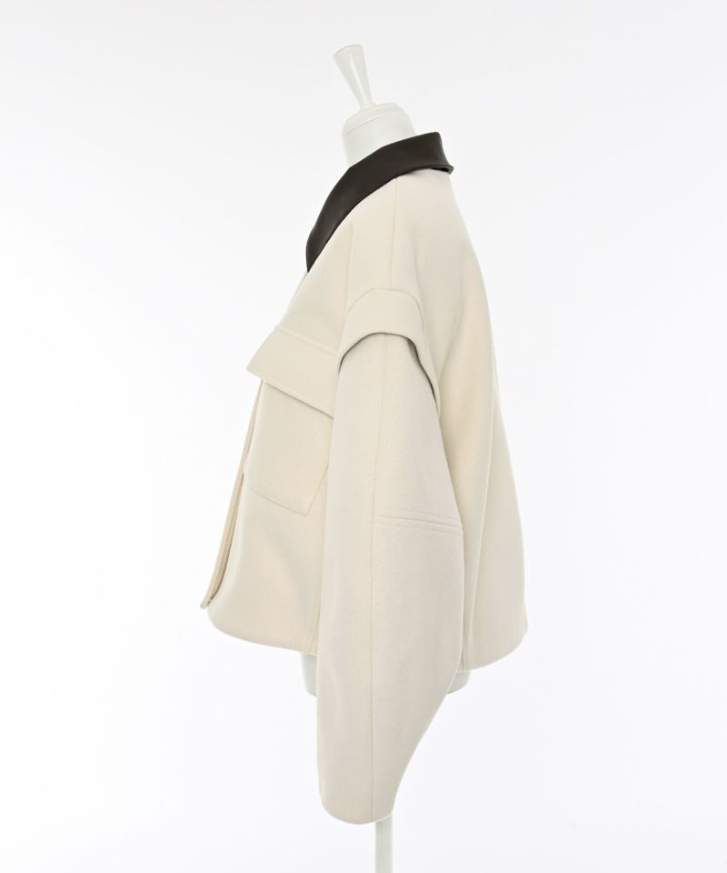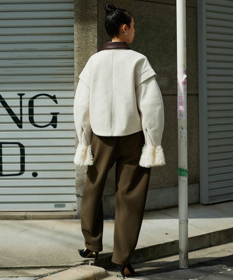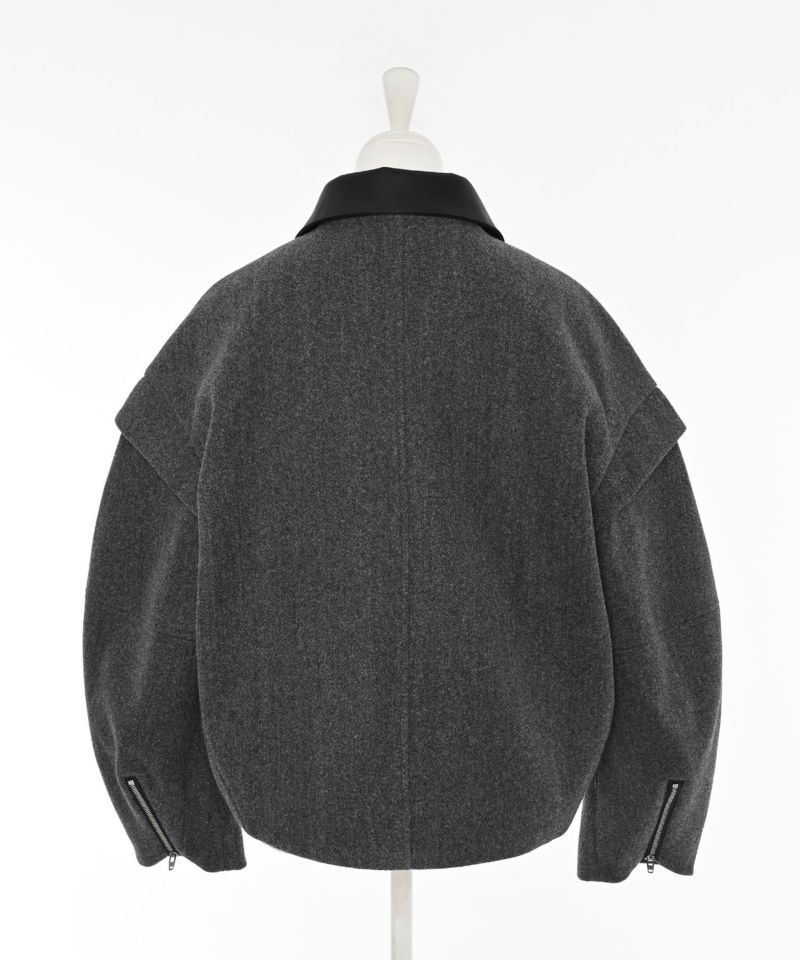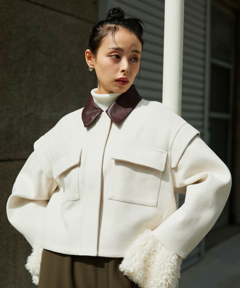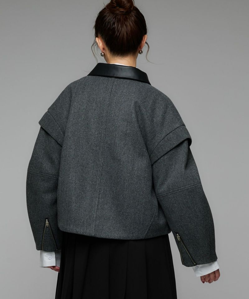 2WAY仕様のフェイクレザーカラーが目を惹くショートジャケット。袖口のファスナーでボリュームやシルエットのニュアンスを変えられる、デザイン性の高い一着です。