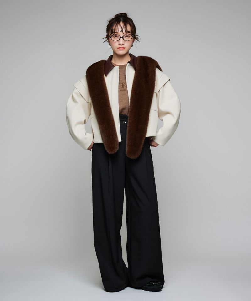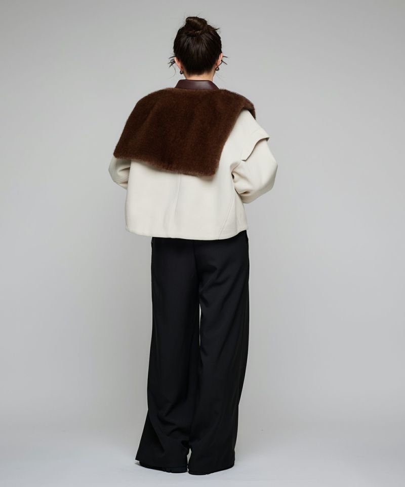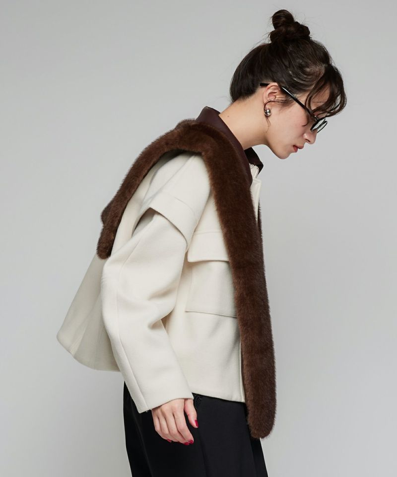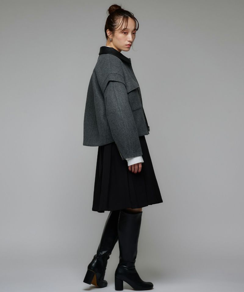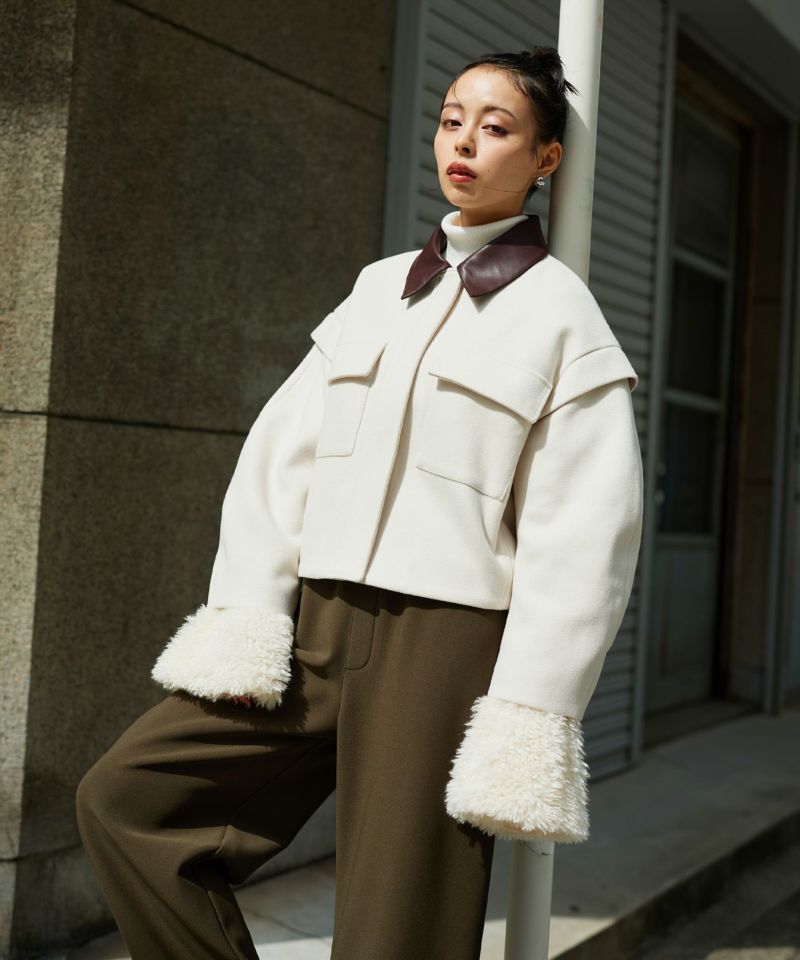 2WAY仕様のフェイクレザーカラーが目を惹くショートジャケット。袖口のファスナーでボリュームやシルエットのニュアンスを変えられる、デザイン性の高い一着です。