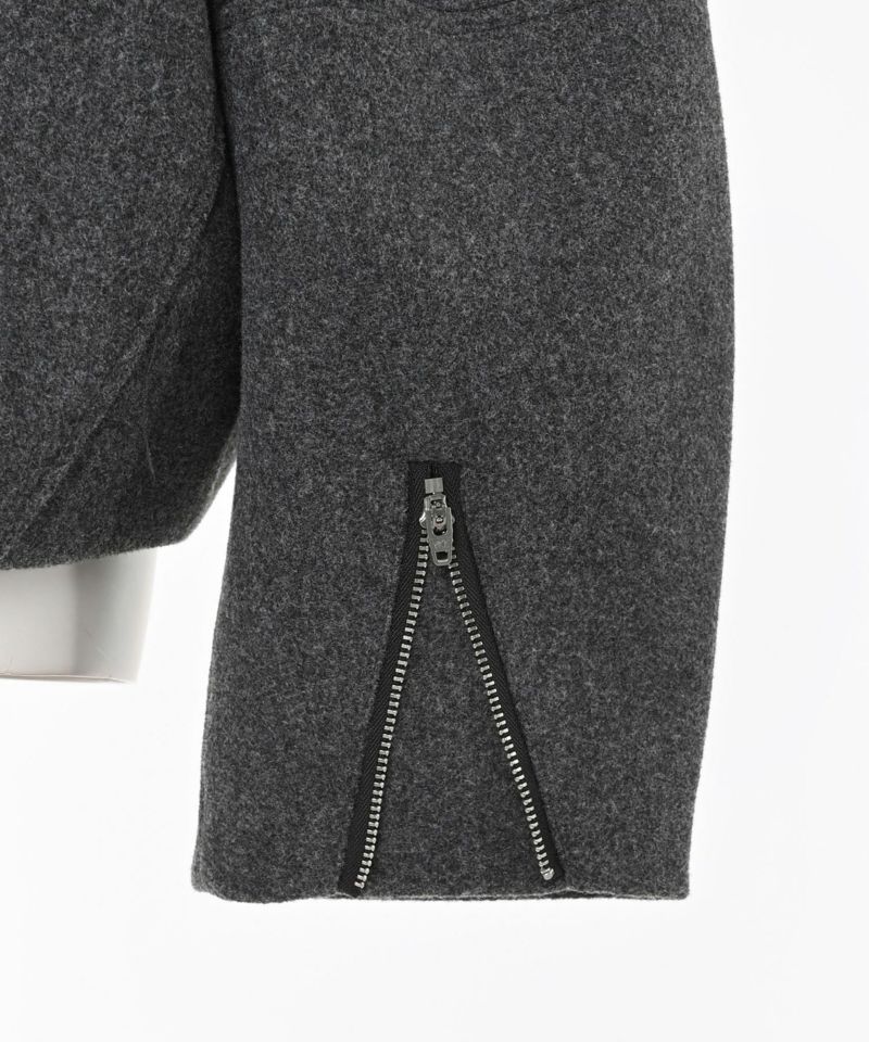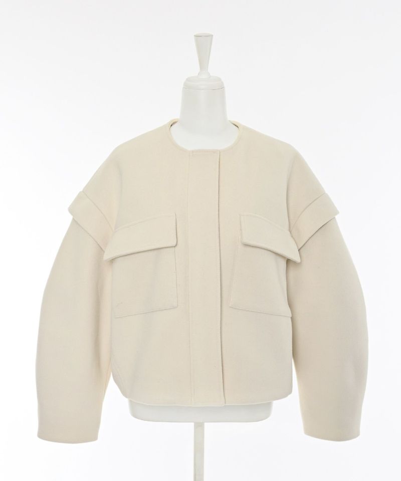 コンパクトな丈感と丸みのあるスリーブがバランスよく、立体的なフォルムを演出。フロントのフラップポケットがアクセントになり、シンプルながらも存在感のあるデザインに。また、ボタンで取り外し可能な襟は、スタイルに合わせて抜け感のあるノーカラージャケットにも変化する2WAY仕様です。フロントは、ジップとスナップボタンを使用した比翼仕立てですっきりとした上品な印象に。袖口のファスナーを開閉することでシルエットに動きをプラスできるのもポイント。