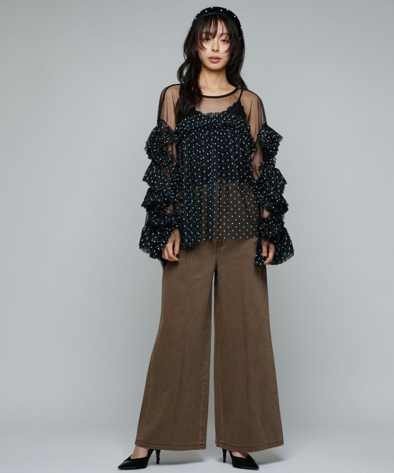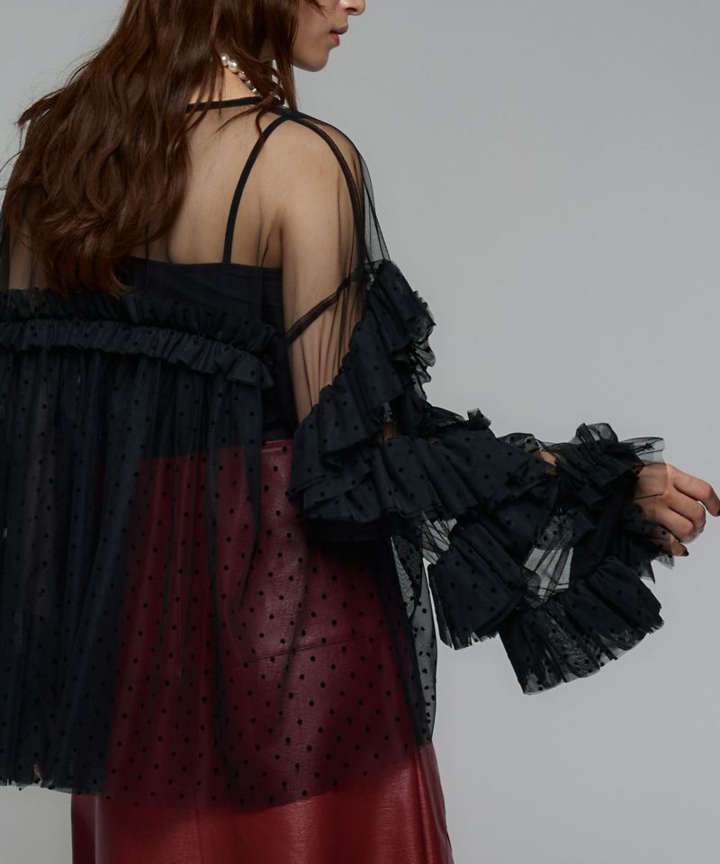ドット柄の可愛らしい雰囲気、落ち着いた色合いと透け感があることで大人っぽい女性らしさを引き出してくれるアイテム。ボリュームのあるフリル袖が個性をプラスし、コーディネートの主役として活躍します。