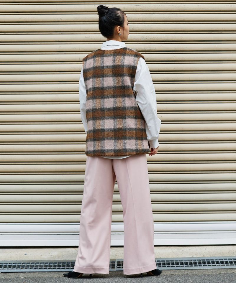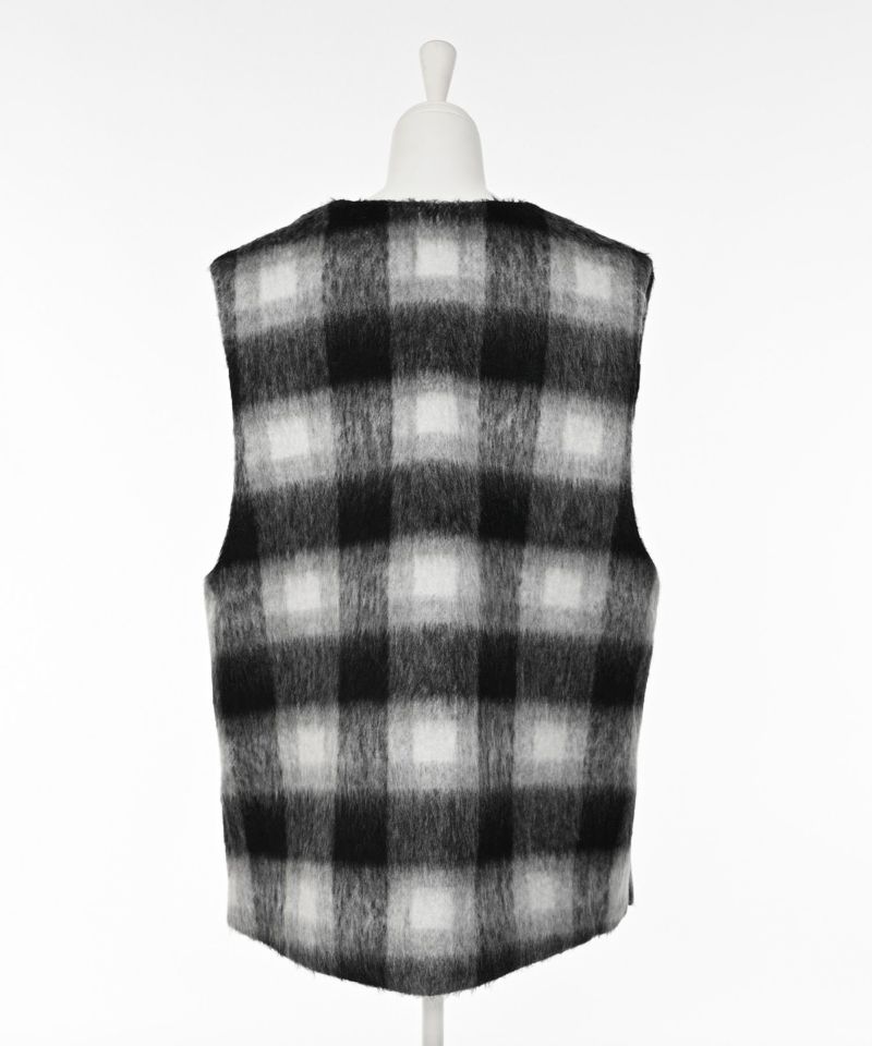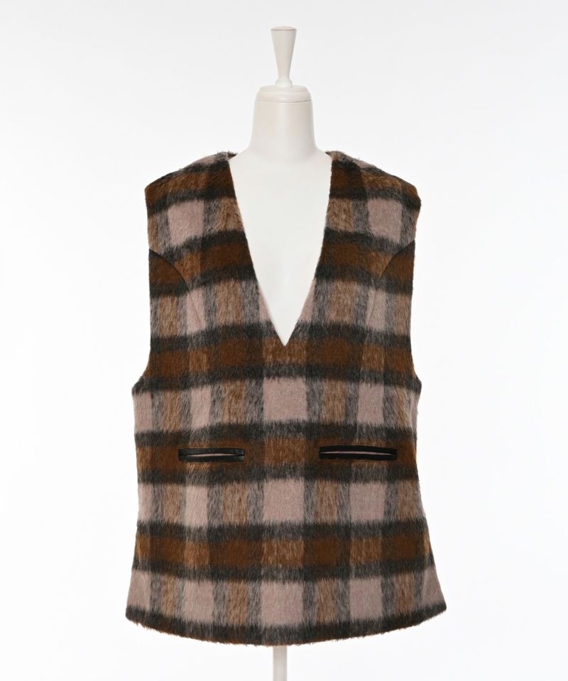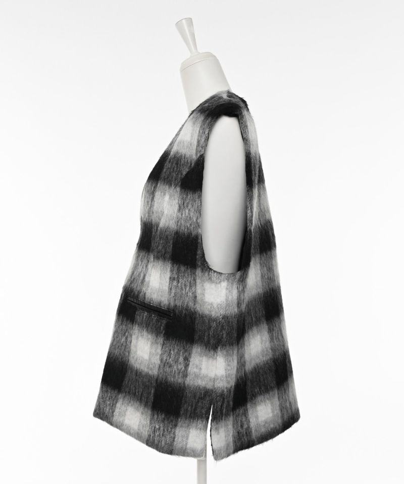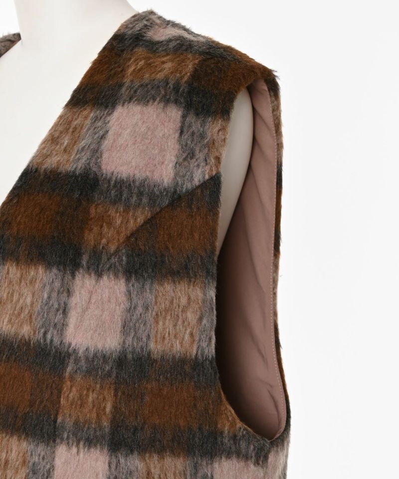 深めに空いたVネックがシャープな印象を演出し、大きめのチェック柄が大人っぽさをプラス。フロントにはポケットを備え、デザイン性だけでなく実用性も兼ね備えています。アームホールは広めに設計されているため、インナーの素材を選ばずレイヤードを楽しめるのも魅力。毛足が短めのシャギー素材で、扱いやすさと洗練された雰囲気を両立した一枚です。