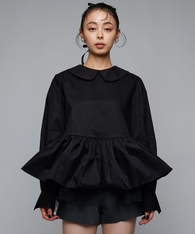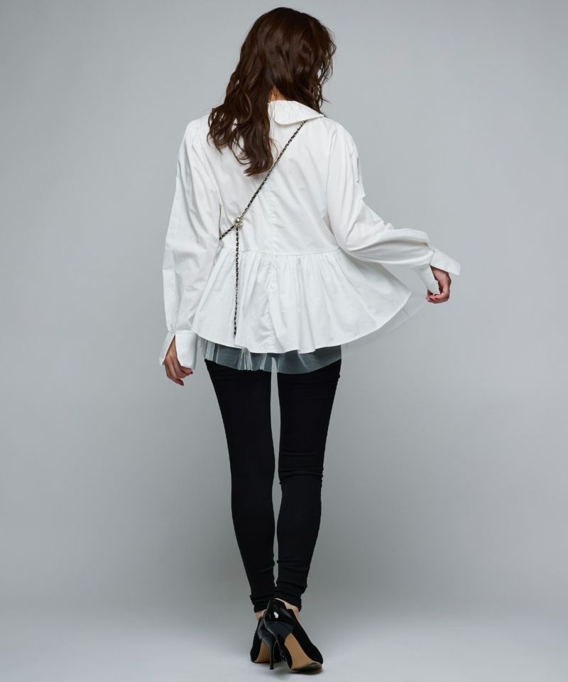 ラウンドカラーとペプラムシルエットが可愛らしいブラウス。裾からチラ見えするチュール素材がフェミニンさをプラス。ウエスト切り替え部分にベルトを巻くと、更にスタイルアップ効果を◎肌寒い季節になると、上からクロップド丈のニットやカーディガンなどをレイヤードするのもオススメ。【model】H160 B80 H85 / H165 B78 H83