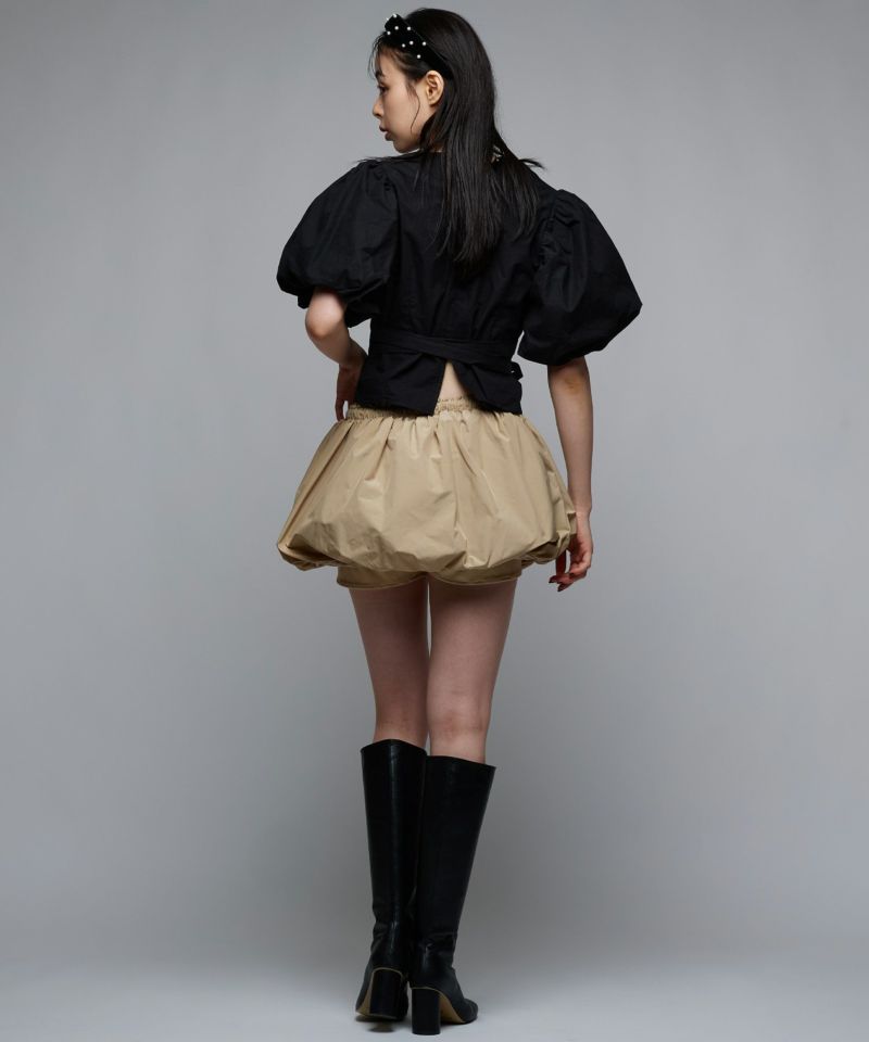 視線を惹きつける丸みのある立体的なフォルムのバルーンミニスカート。シルエットを綺麗に魅せられる適度なハリ感がポイント。インナーパンツ付きで安心して着用いただけます。ウエストはゴムとリボンになっているのでストレスフリーな着心地に◎【model】H160 B80 H85 / H165 B78 H83