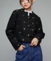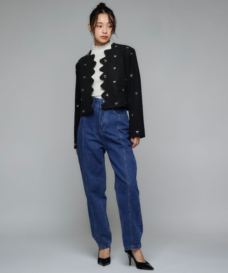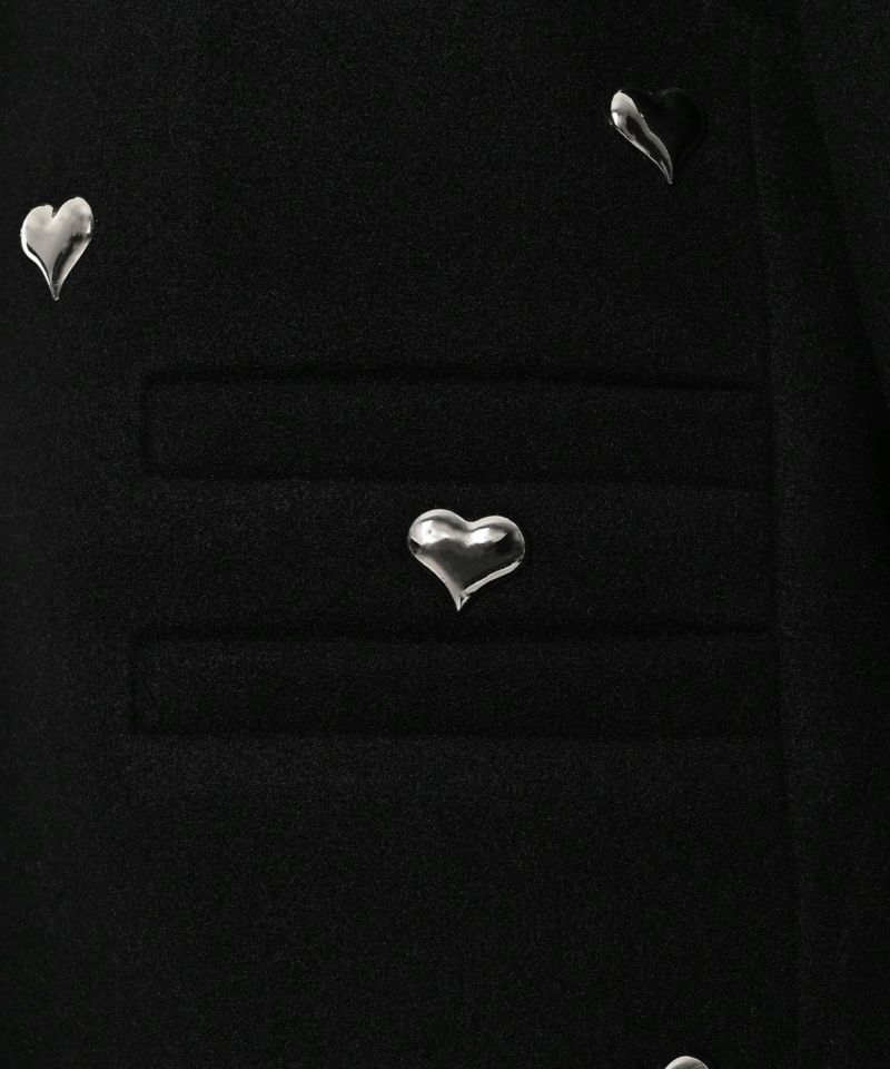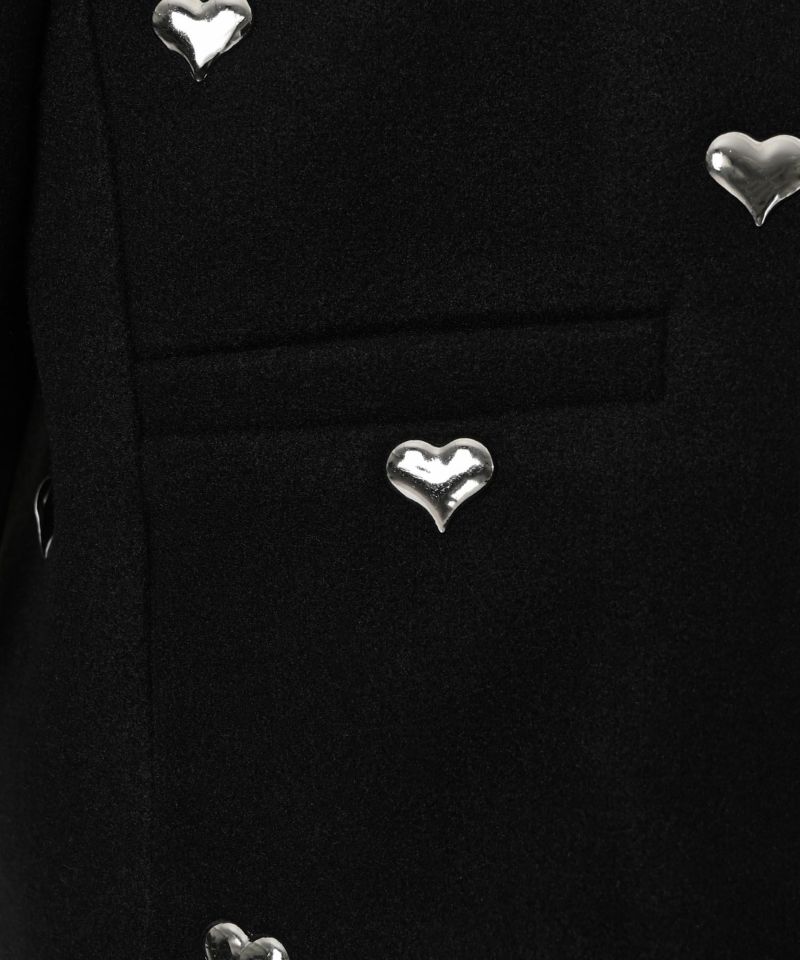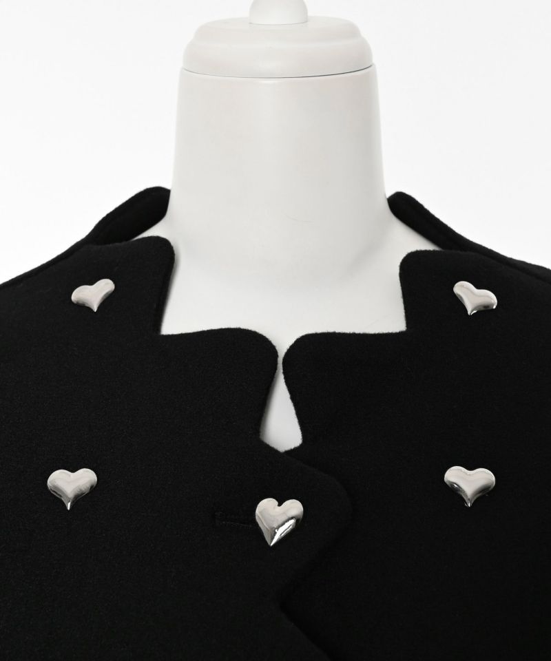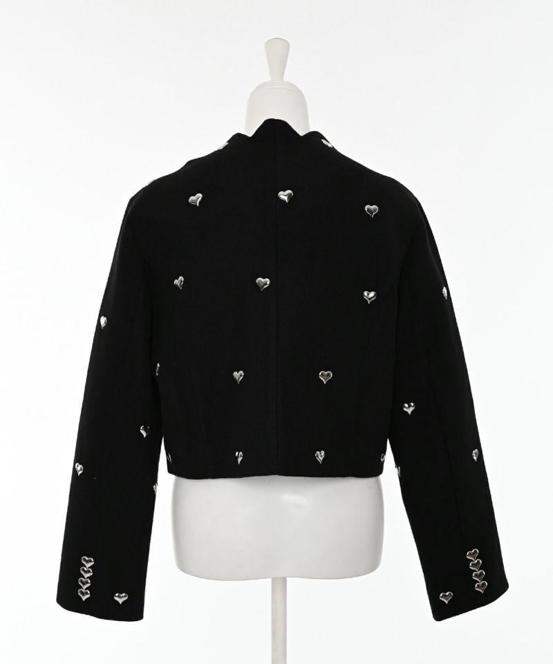 ジャケット全体にハートモチーフの金具を散りばめた、存在感のある一着。遊び心のあるディテールが洗練されたムードを引き立て、羽織るだけでコーディネートの主役になります。