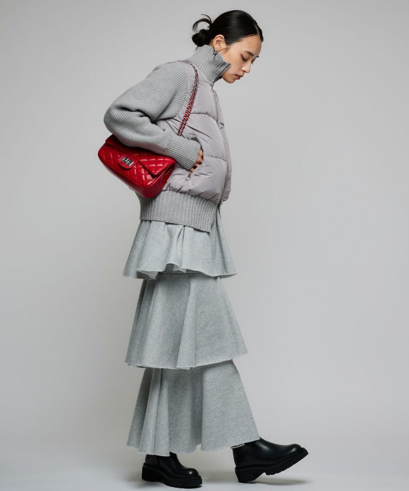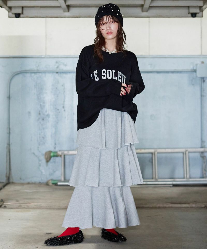 3段フリルの立体感が華やかで、動くたびにふんわりと揺れるカンカンシルエット。スウェット素材ならではの程よいカジュアルさが加わり、甘すぎずこなれた印象に。デイリー使いはもちろん、トップス次第で幅広いスタイリングを楽しめます。