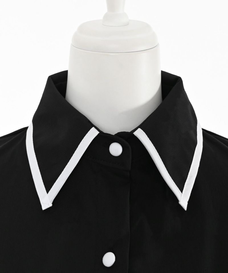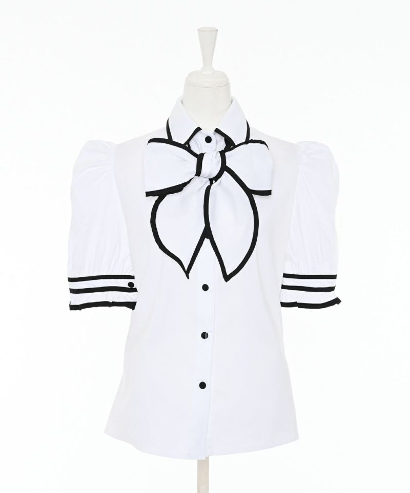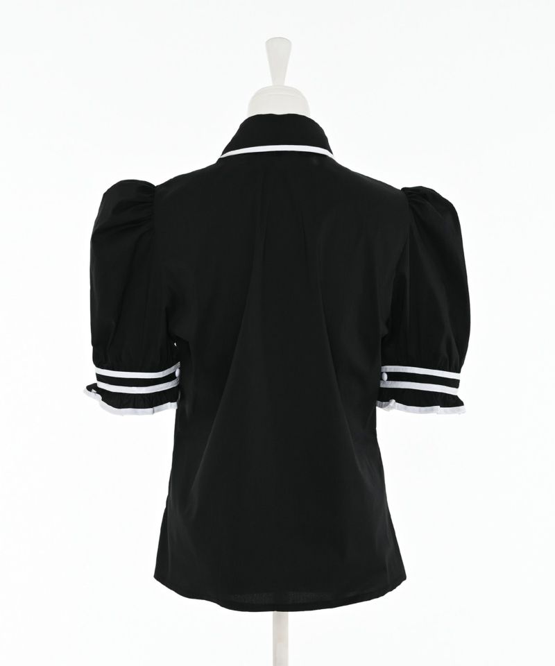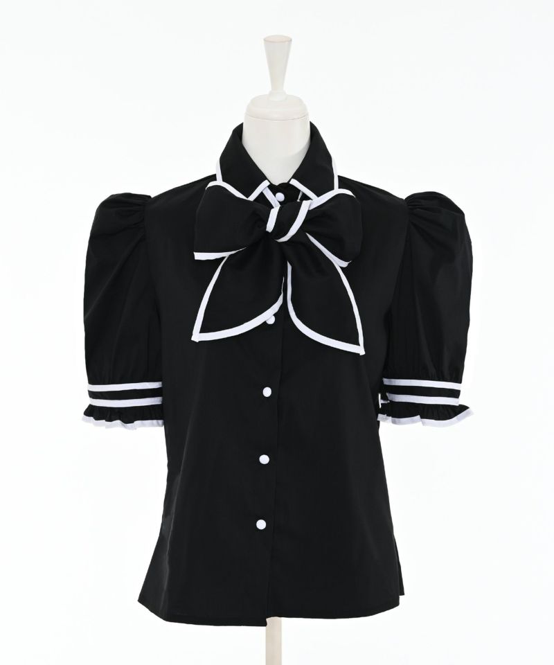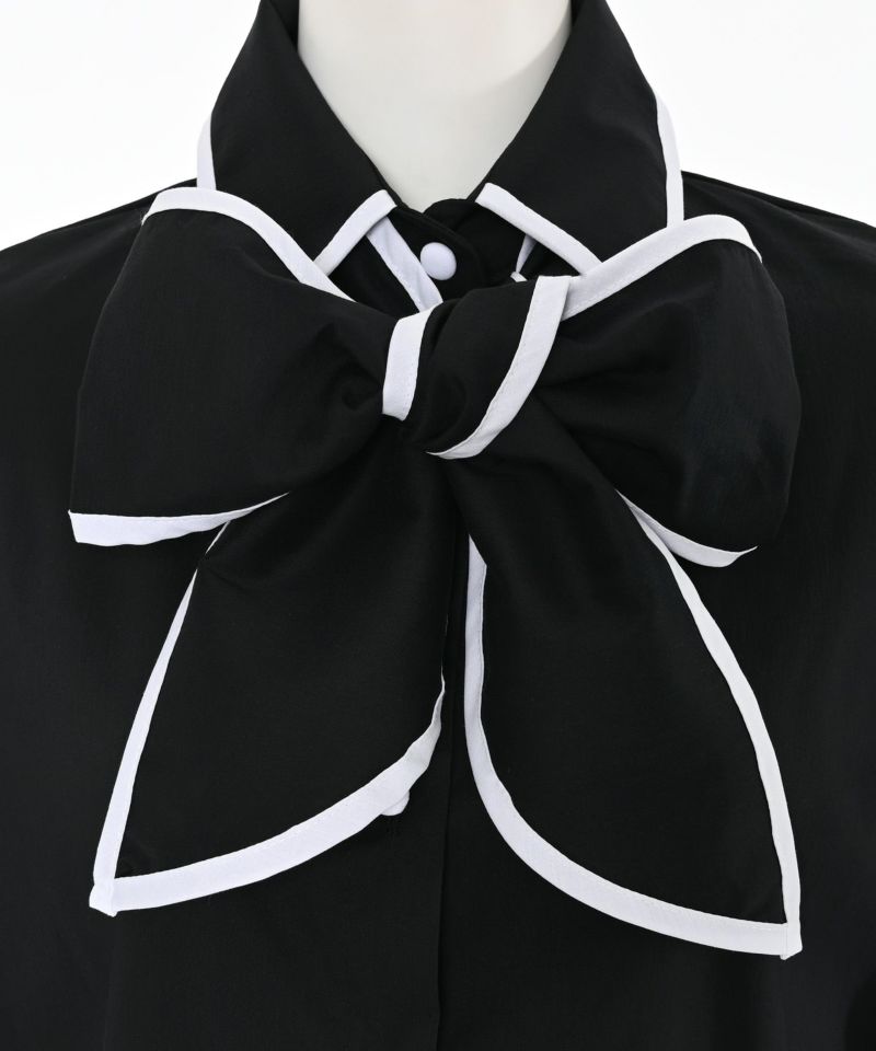 バイカラーのパイピングと取り外し可能なリボンタイが目を引く、フェミニンなブラウス。パフスリーブと袖口のさりげないフリルが可愛らしさをプラス。一枚で存在感を放ち、コーディネートの主役になるアイテムです。
