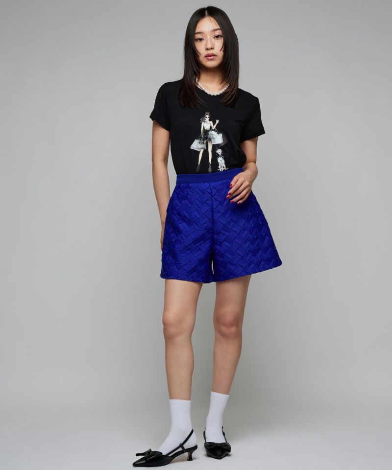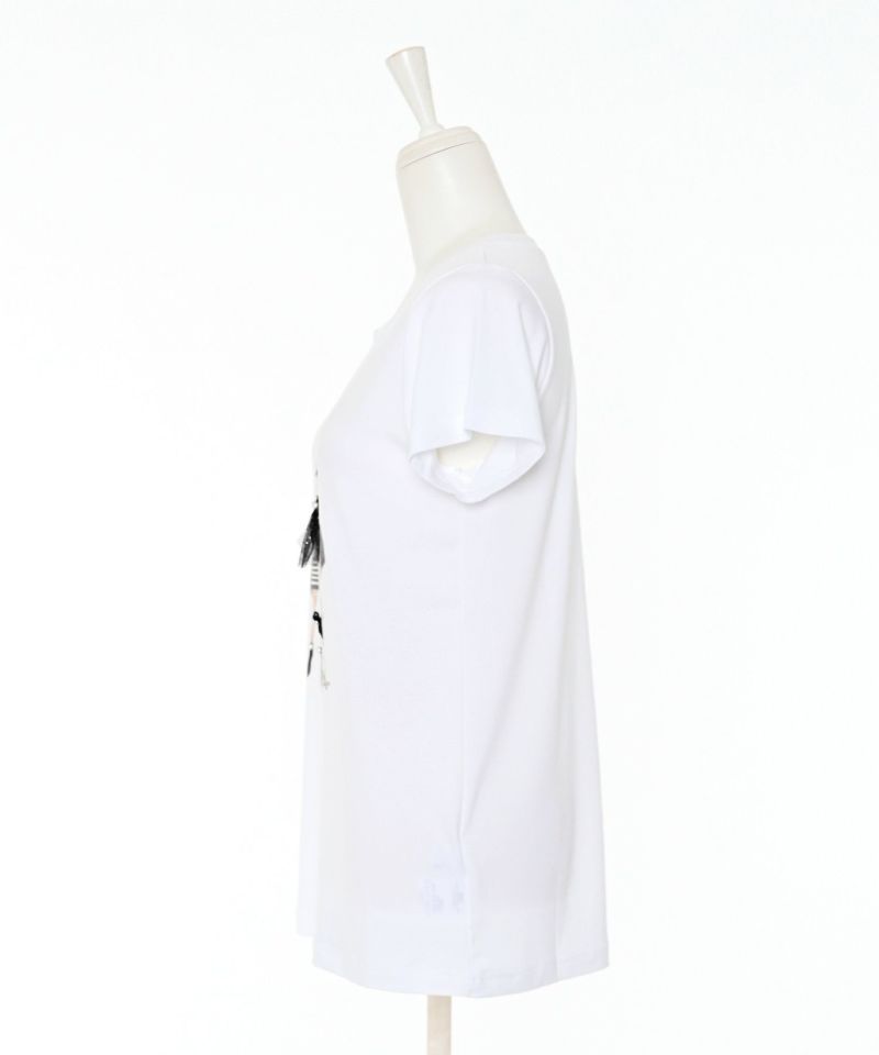 フロントのガールプリントが目を惹くトップス。ビジューやパール、チュールなど細かい装飾が立体感を引き立て高見えするデザインに。テロッとした落ち感のある素材が上品リラックスを叶えます。ミニボトムスからデニムまで、ボトムスを選ばず着用いただけます。
