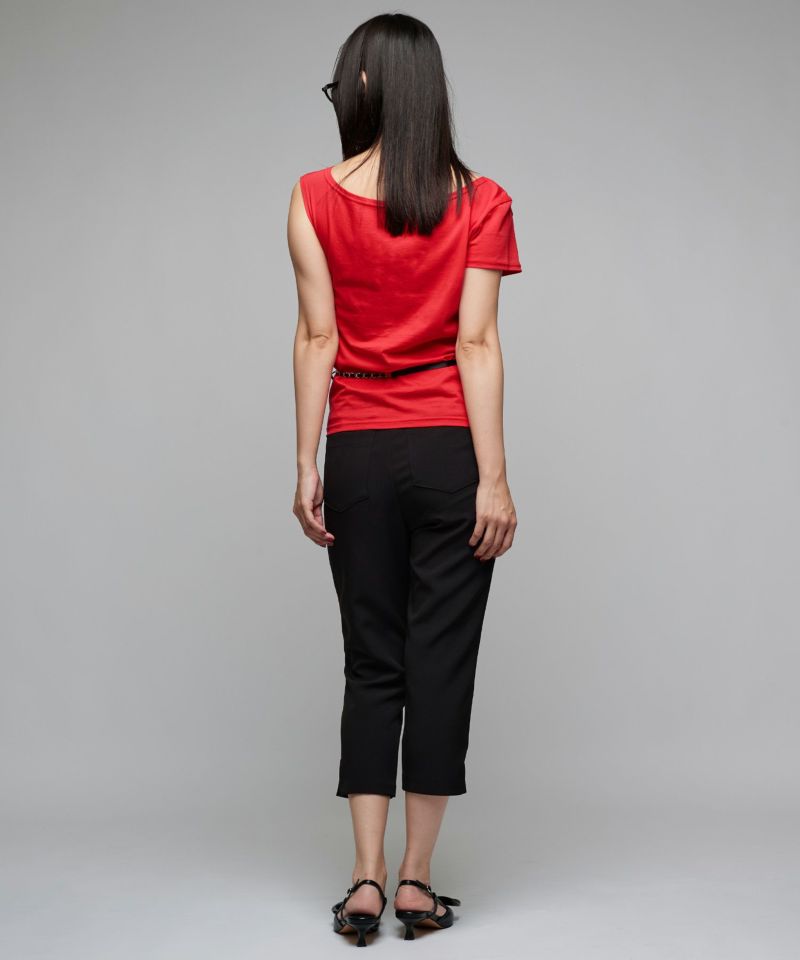左右の袖がアシンメトリーになったTシャツ。ボディラインにフィットするシルエットで、伸縮性のある薄手の素材が風通しも良く着心地◎シルエットにはデザイン性がありますが、ベーシックな無地Tシャツなので様々なボトムスと合わせやすい着回し力抜群のアイテム。【model】H163 B78 H84