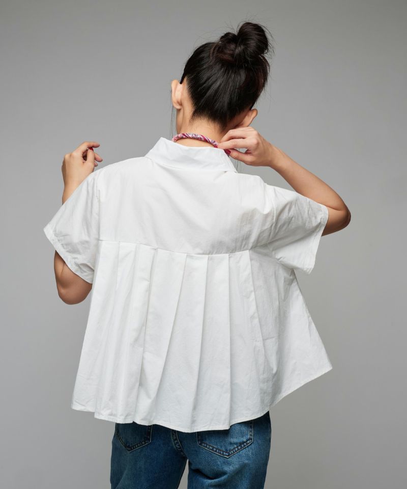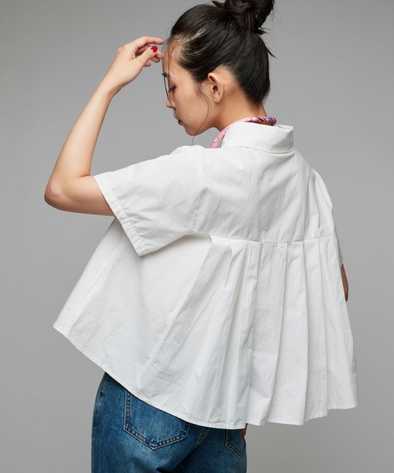 前後アシンメトリーシャツ。バックにプリーツデザインが施されていて、フロントよりも少し着丈が長めに設定されているデザイン。クロップド丈&裾に向かって広がるフレアシルエットなので、タイトめなボトムスを合わせるとバランスよく着用できます。【model】H163 B78 H84