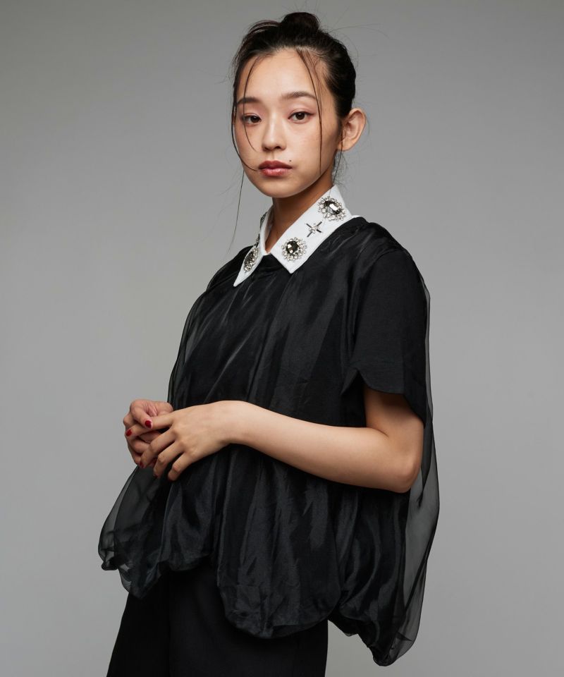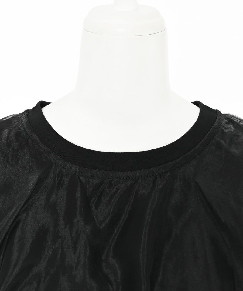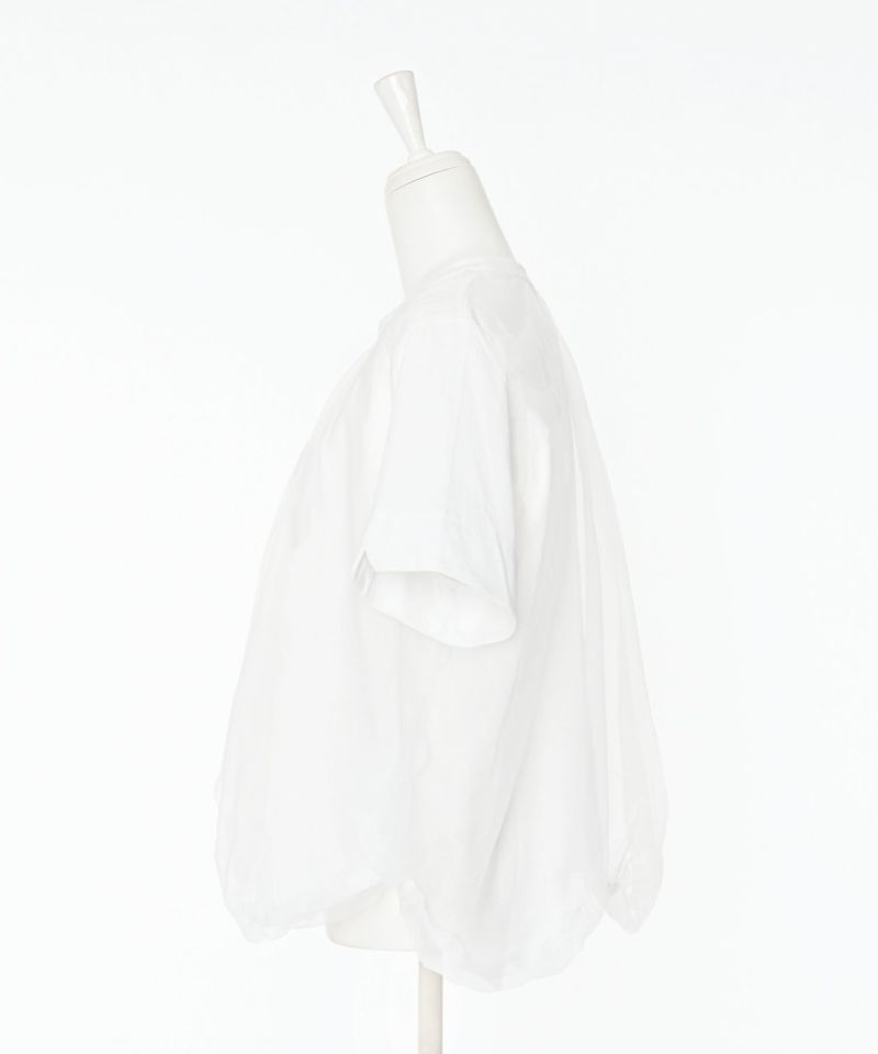 Tシャツの身頃にオーガンジー素材をドッキングさせ、丸みのあるバルーンシルエットに仕上げたトップス。裾が他にはない独特なディティールで、袖口にさりげないスリットデザインを施しています。ボリュームのあるデザインになっているので、タイトめなボトムスと相性◎【model】H163 B78 H84