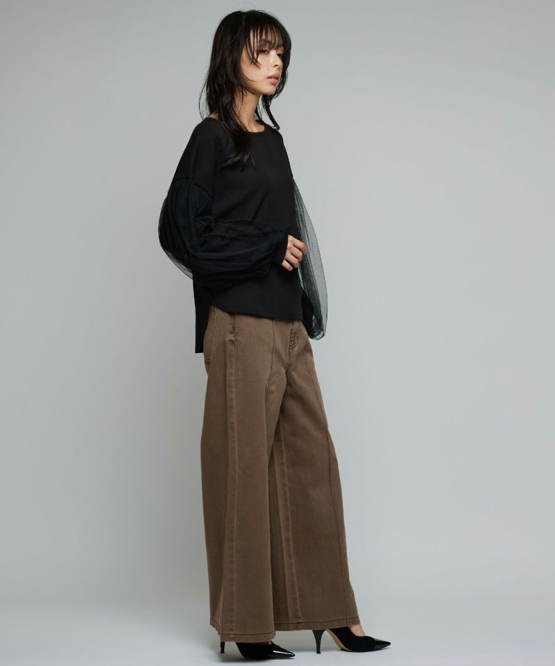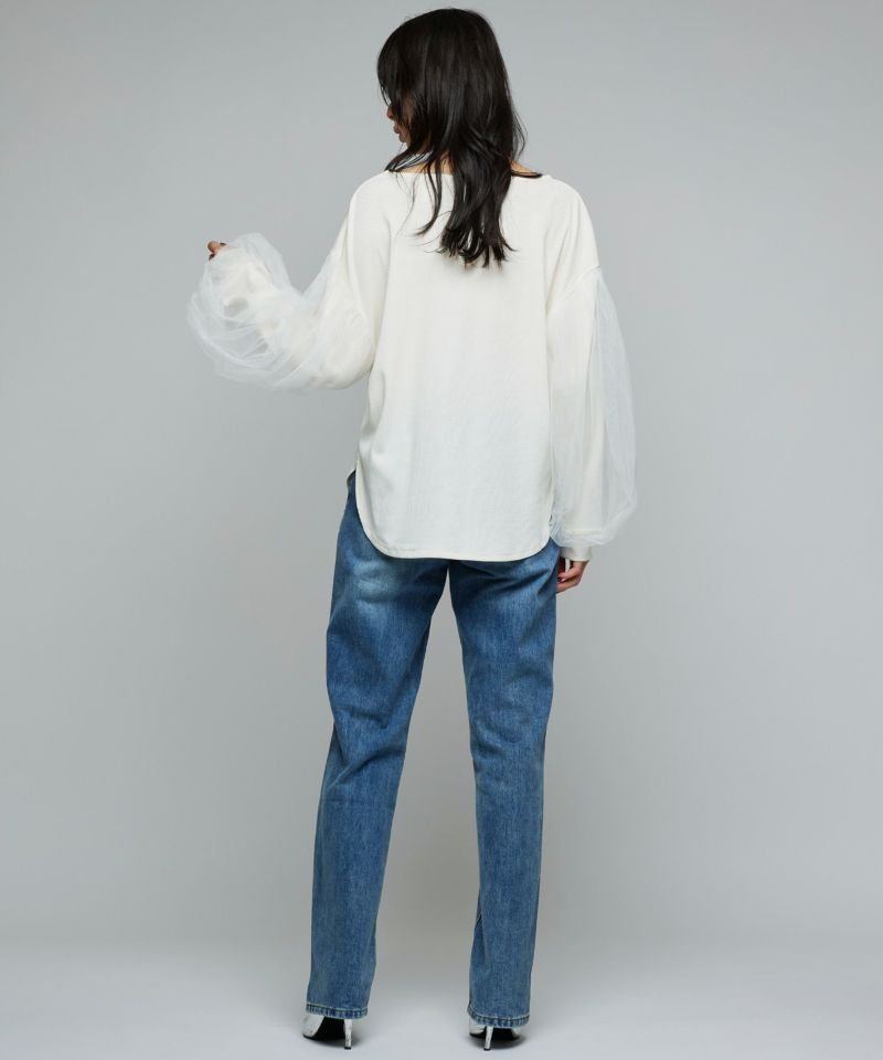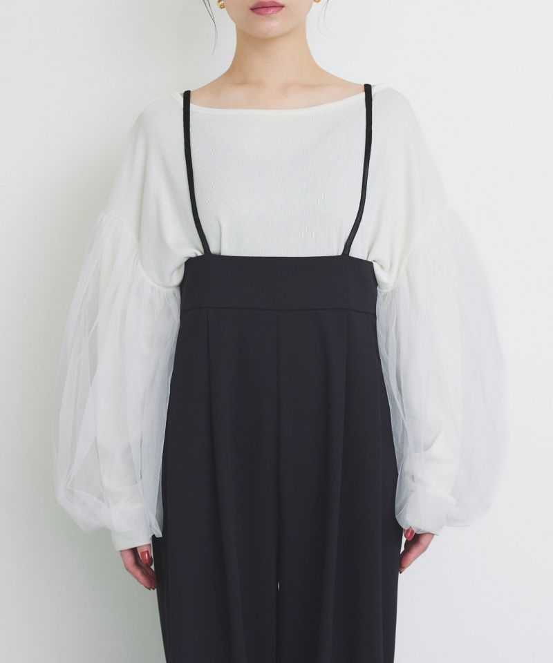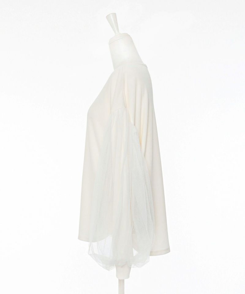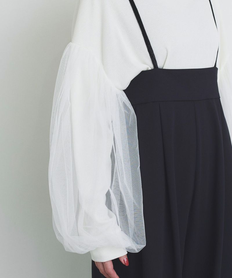 【ポイント】 柔らかなチュールをまとったスリーブが、動くたびに軽やかな表情をプラス。 身頃と同色で統一することで甘さを抑え、大人っぽく着こなせるカットソー。 【デザイン・シルエット】 身体のラインを拾いすぎない程よいゆとりと、柔らかなリブ素材が心地よい着用感を叶える一枚。広めに開いたネックラインは顔まわりをすっきりと見せ、透け感のあるチュールスリーブが軽やかな抜け感を演出します。袖にたまる立体的なシルエットが華奢見えを引き立て、シンプルなカットソーながら女性らしさと華やかさを兼ね備えたデザイン。 【おすすめのスタイリング】 いつものデニムに合わせるだけで、シンプルながらも女性らしい華やかさをプラス。 ワントーンなデザインなので、カラーや柄物のボトムとも相性抜群です。 ワンピースのインナーとしてレイヤードすれば、さりげなくトレンド感も演出。 毎日のワードローブに取り入れやすく、デイリーからちょっとしたお出かけまで、幅広く活躍する万能トップスです 【素材】 優しく肌に馴染む、薄手で柔らかなリブ素材を使用。程よい伸縮性があり、快適な着心地を叶えます。袖にドッキングしたチュールもソフトな質感で、ストレスフリーに着用できるのが嬉しいポイント。【model】H160 B80 H85 / H165 B78 H83