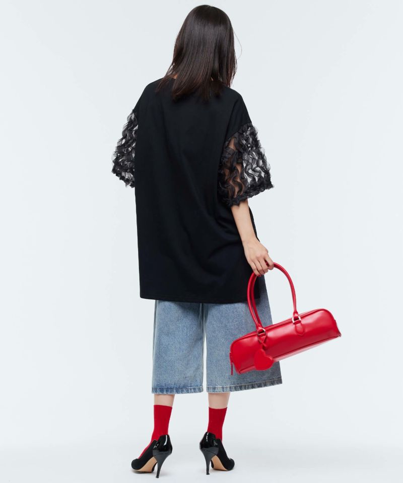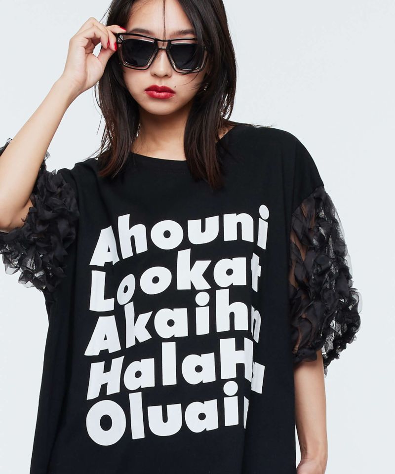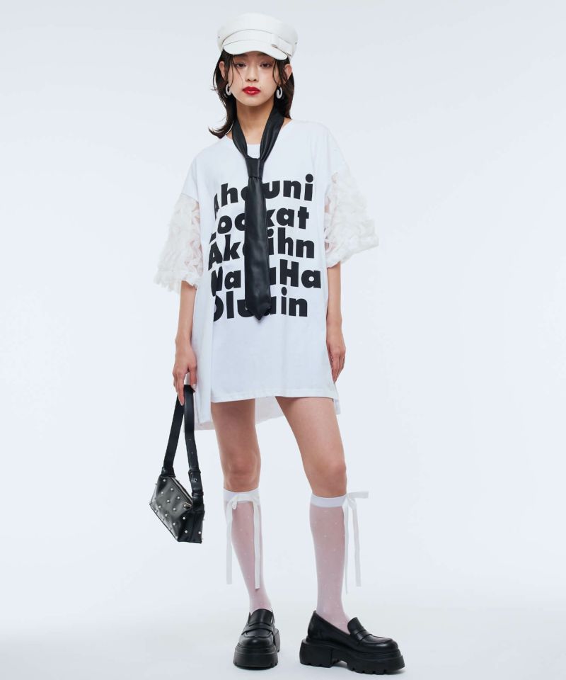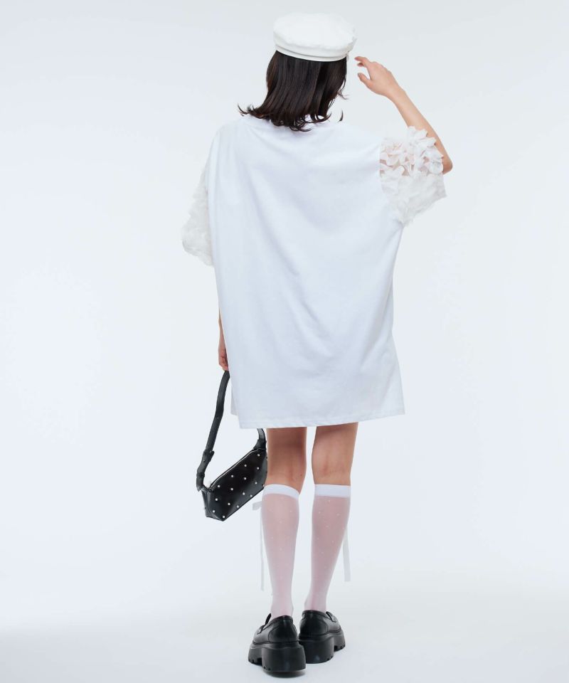 オーバーロゴTシャツにチュール素材のパフスリーブをドッキングしたデザイン性のあるトップス。サイドスリットが入っていることで、インスタイルも綺麗に叶えてくれる。ワンピース風にも着用できるロング丈。【model】H163 B78 H84