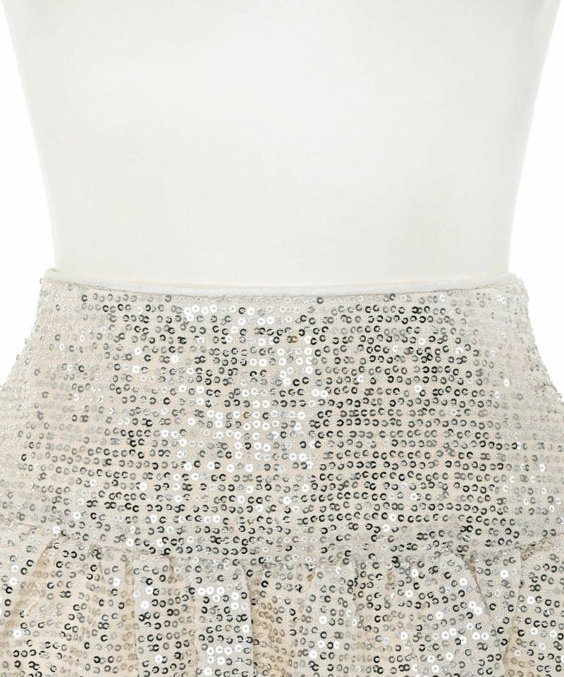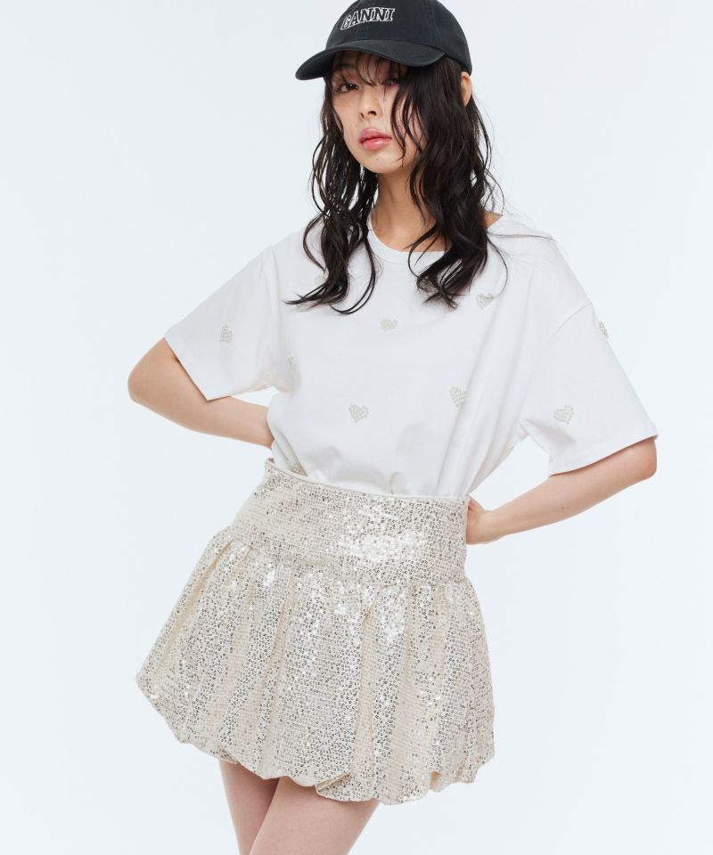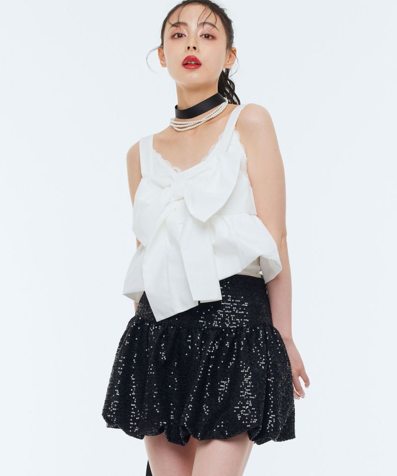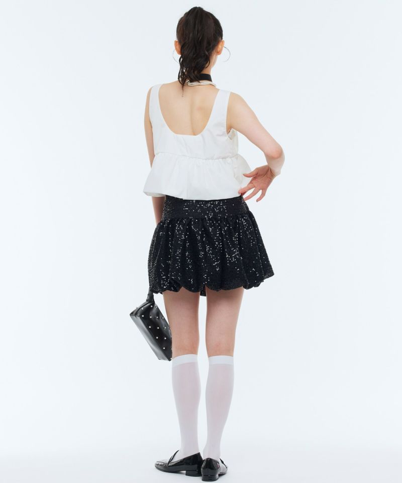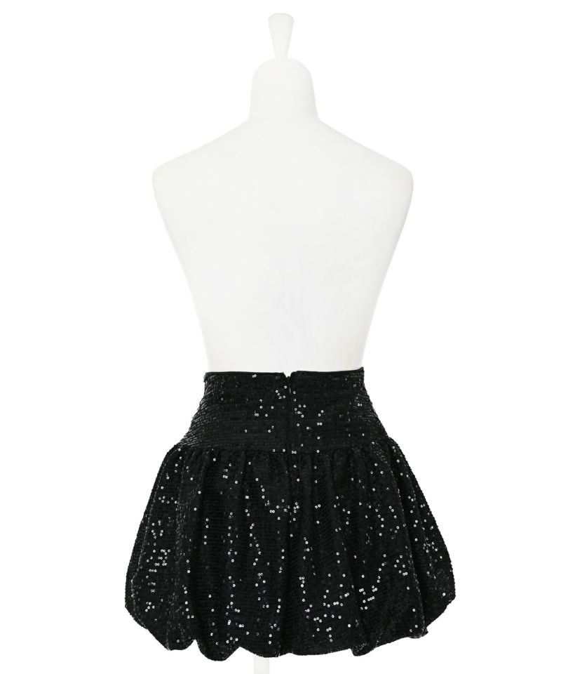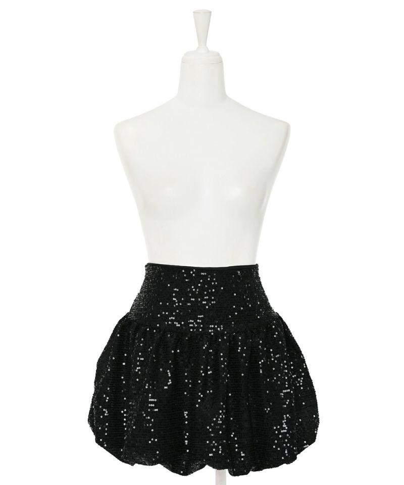 トレンドのバルーンスカートに、スタイリングのアクセントになるスパンコールを全面に使用した存在感抜群のアイテム。ジップ付きで着脱しやすく、ペチパンツ付きなので安心して着用できる。【model】165㎝ / H160 B80 H85