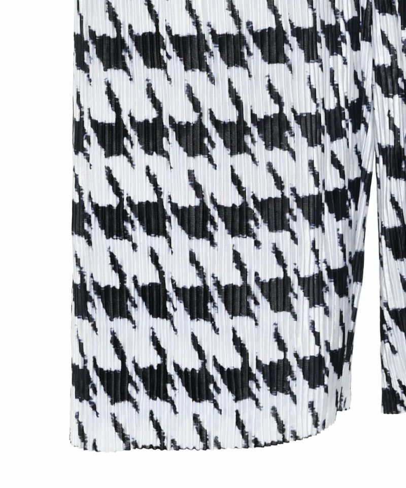 サラッとした落ち感のあるプリーツ素材が、ストレスフリーに着用できるリラックスパンツ。モノトーンの千鳥柄がクラシカルな印象を与えつつ、ウエストは総ゴムなのが嬉しいポイント。肉感を拾いにくい素材なのでショート丈のトップスやタックインスタイルでも◎