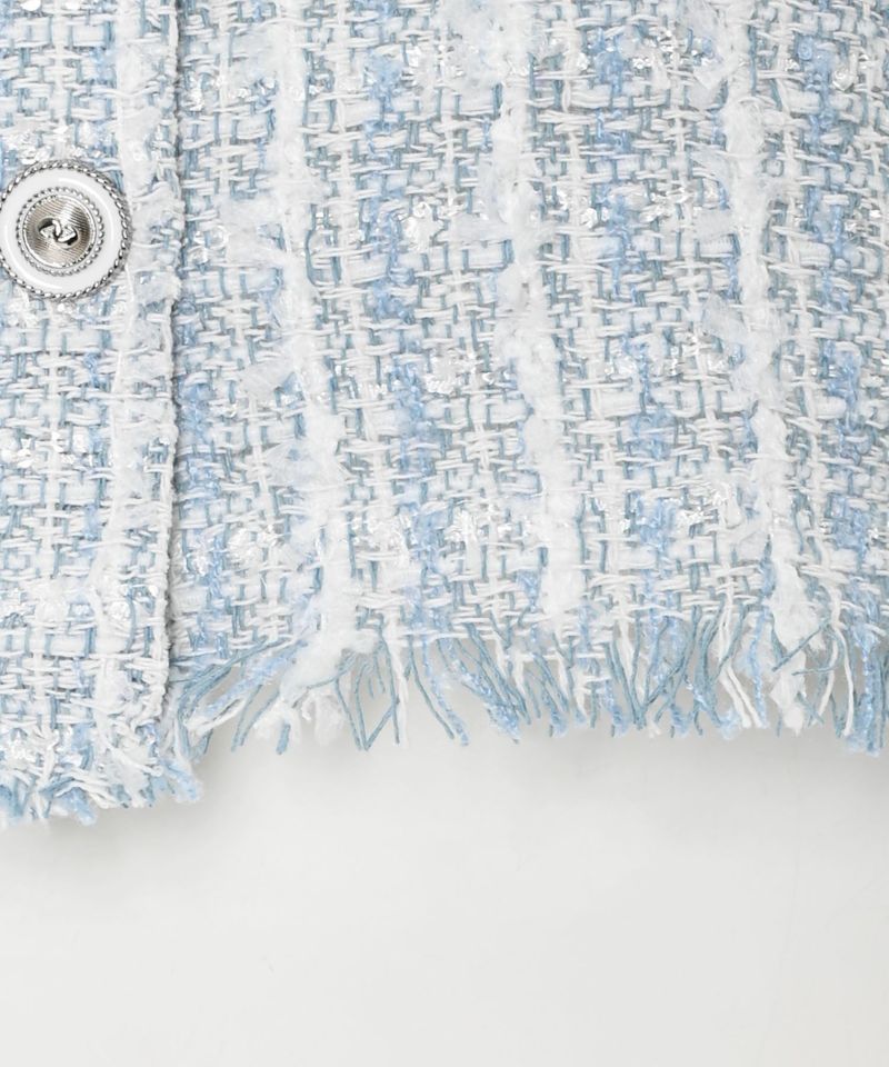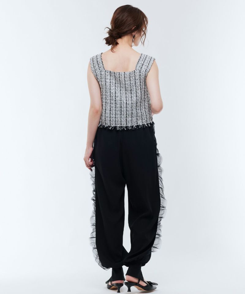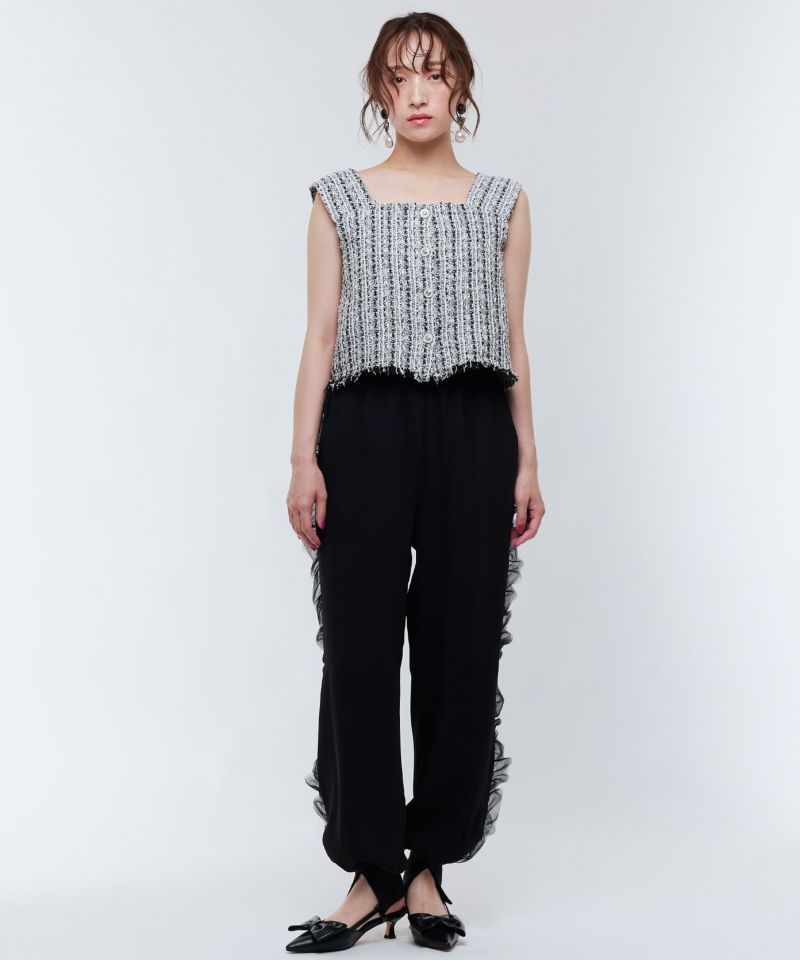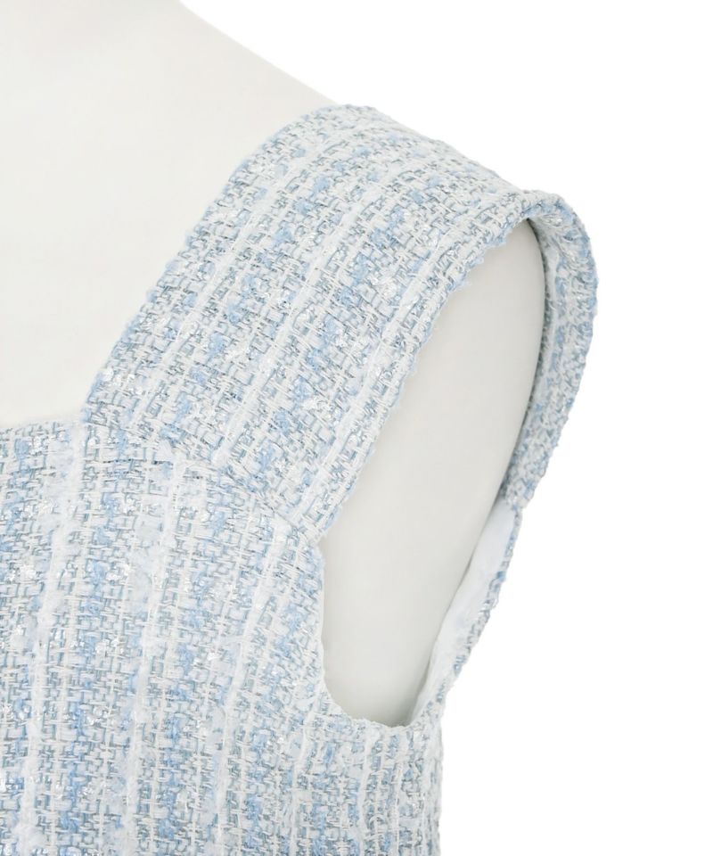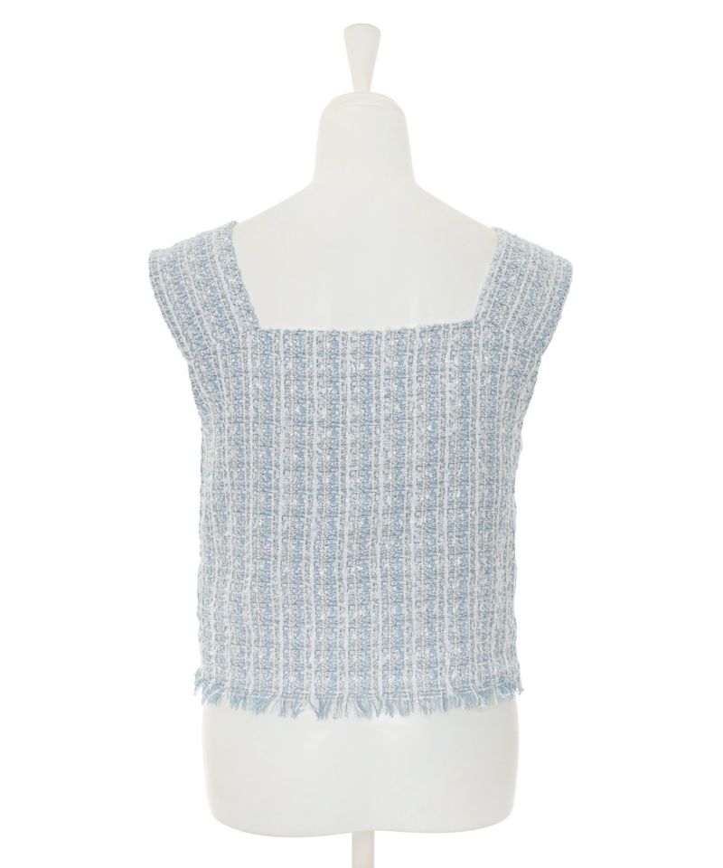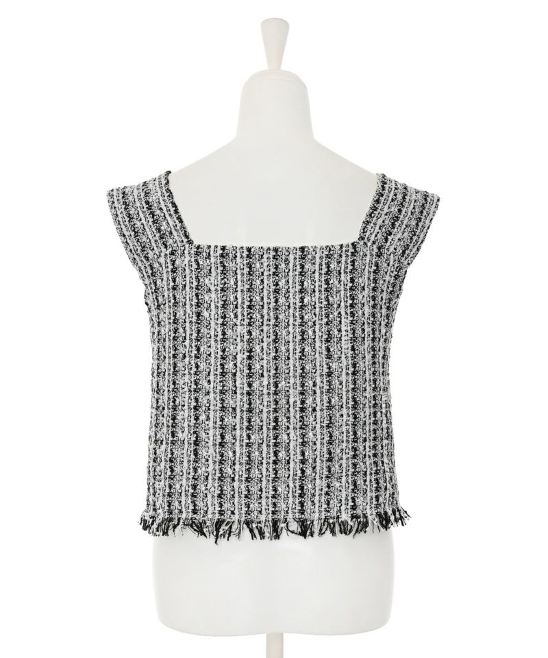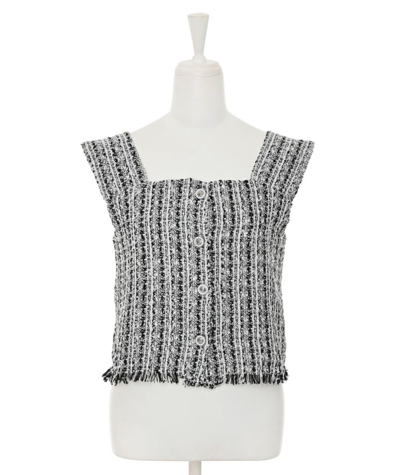 存在感があり、コーディネートに取り入れるだけで華やかさのあるツイード素材を使用したタンクトップ。フロントボタンで上品さをプラスし、デコルテを綺麗見せしてくれるスクエアネックがポイント。フレアスカートなどで綺麗めスタイルはもちろん、デニム合わせでカジュアルダウンさせたスタイリングもオススメ。【model】H160 B80 H85
