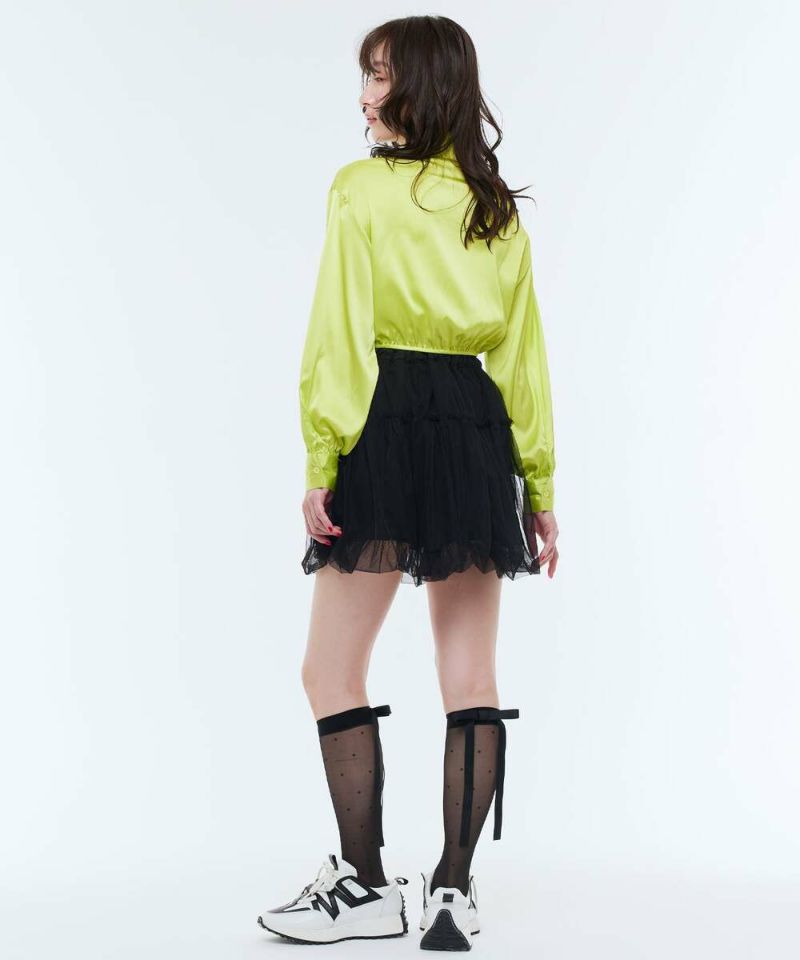 とろみのあるサテン素材のクロップドシャツ。 裾はゴム入りで着るだけでブラウジングしたようなシルエットに。 パキっとしたカラーと程良い光沢が存在感抜群の一枚。 ※フロント最下部のボタンは開閉出来ない仕様となっております。モデル身長:163cm/160cm