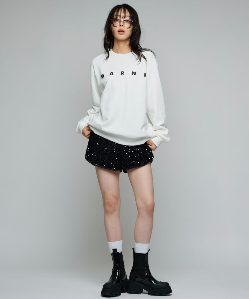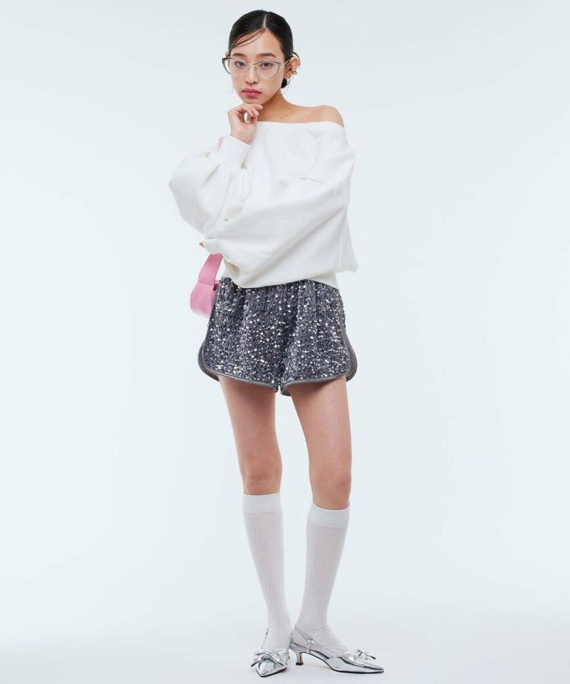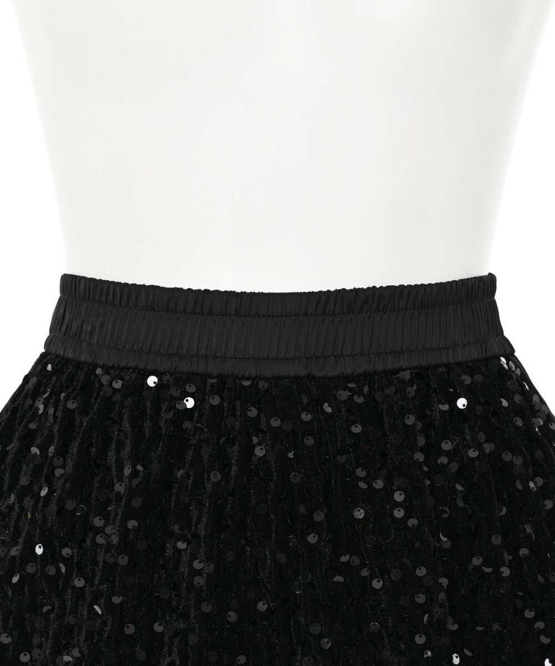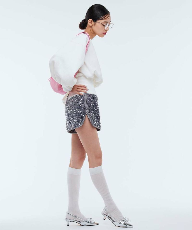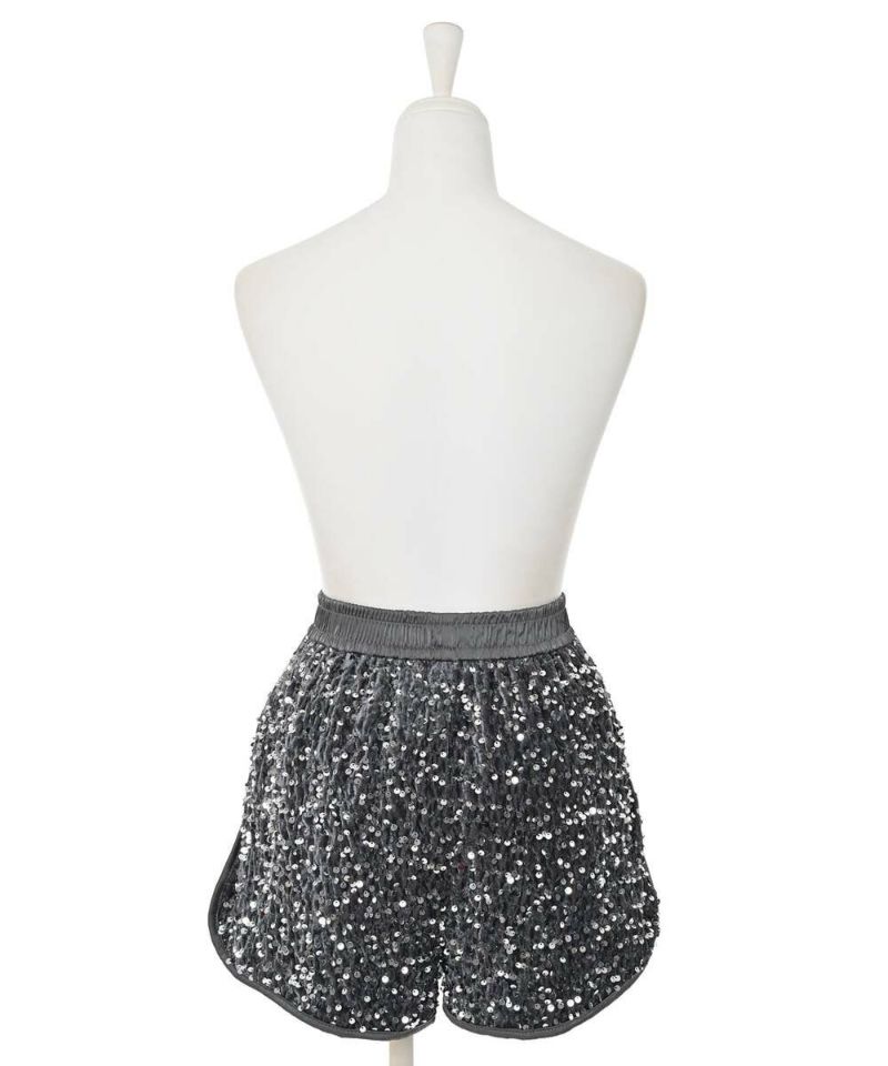 存在感のあるスパンコール素材を、スポーティムードなキックパンツデザインに落とし込んだトレンド感たっぷりのアイテム。ウエストゴムで、ストレスフリーに着用できるサイズ感も嬉しいポイント。【model】H165 B78 H83/H163 B78 H84
