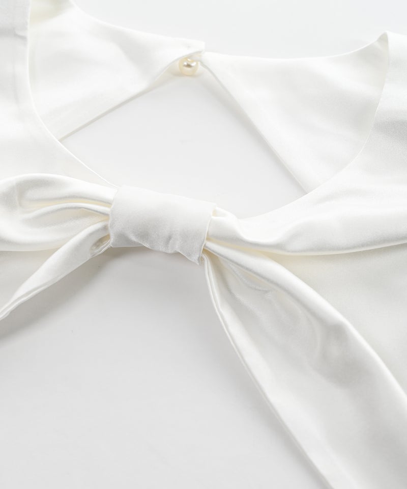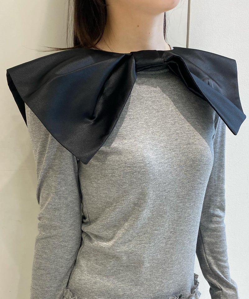 フロントに大きくあしらわれたリボンが目を引く、インパクトのあるデザイン。 程よくハリと光沢のある素材が立体感を生み、甘さの中にモードな雰囲気をプラスします。 首元はシンプルな仕様で着脱しやすく、リボンのボリュームとのバランスも絶妙。 スタイリングに取り入れるだけで、存在感のある着こなしが完成します。