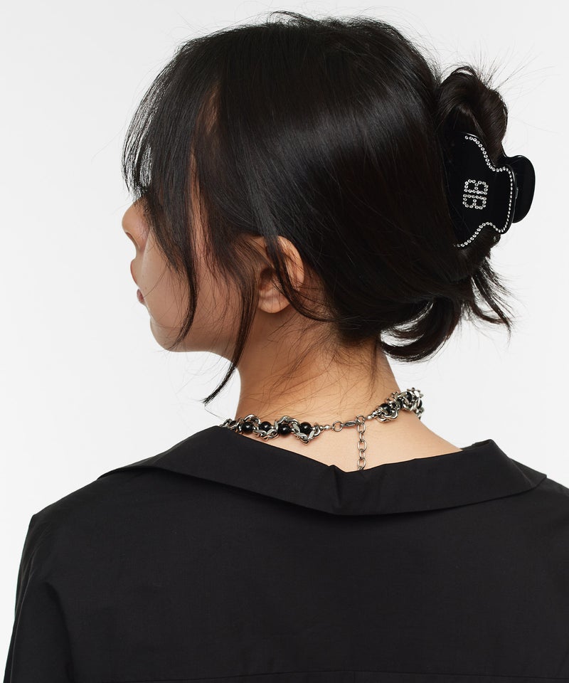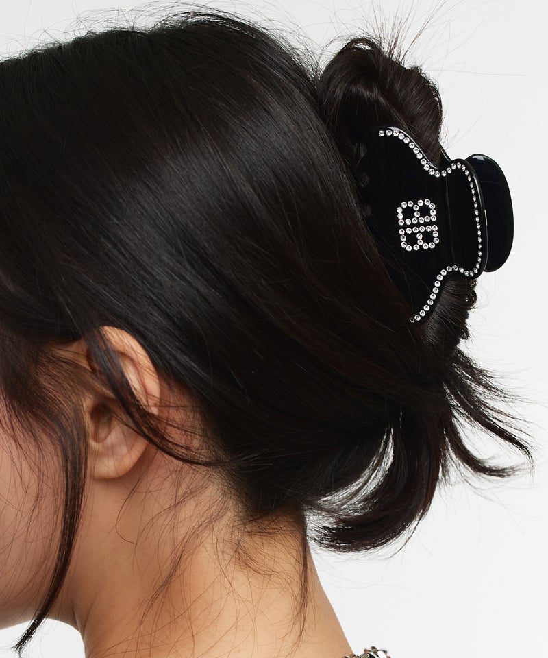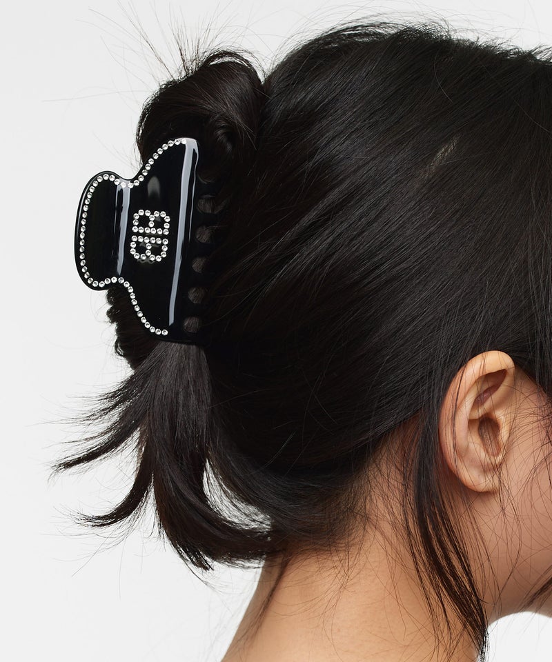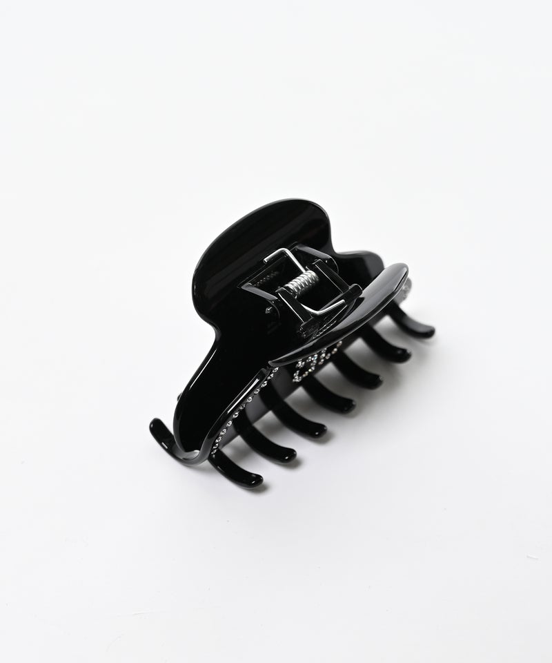 艶やかなブラックボディにラインストーンをあしらった、存在感のあるヘアクリップ。