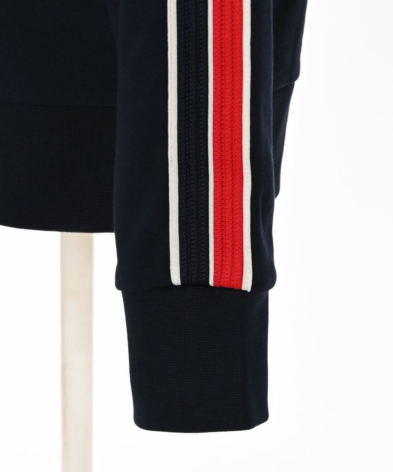・ジャージー素材のダブルラインデザイン・左腕にロゴマーク・裏地パイル素材