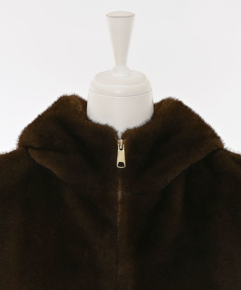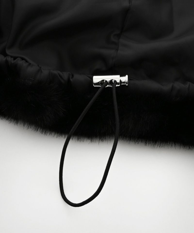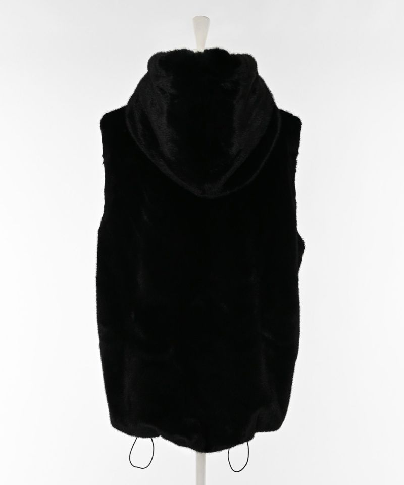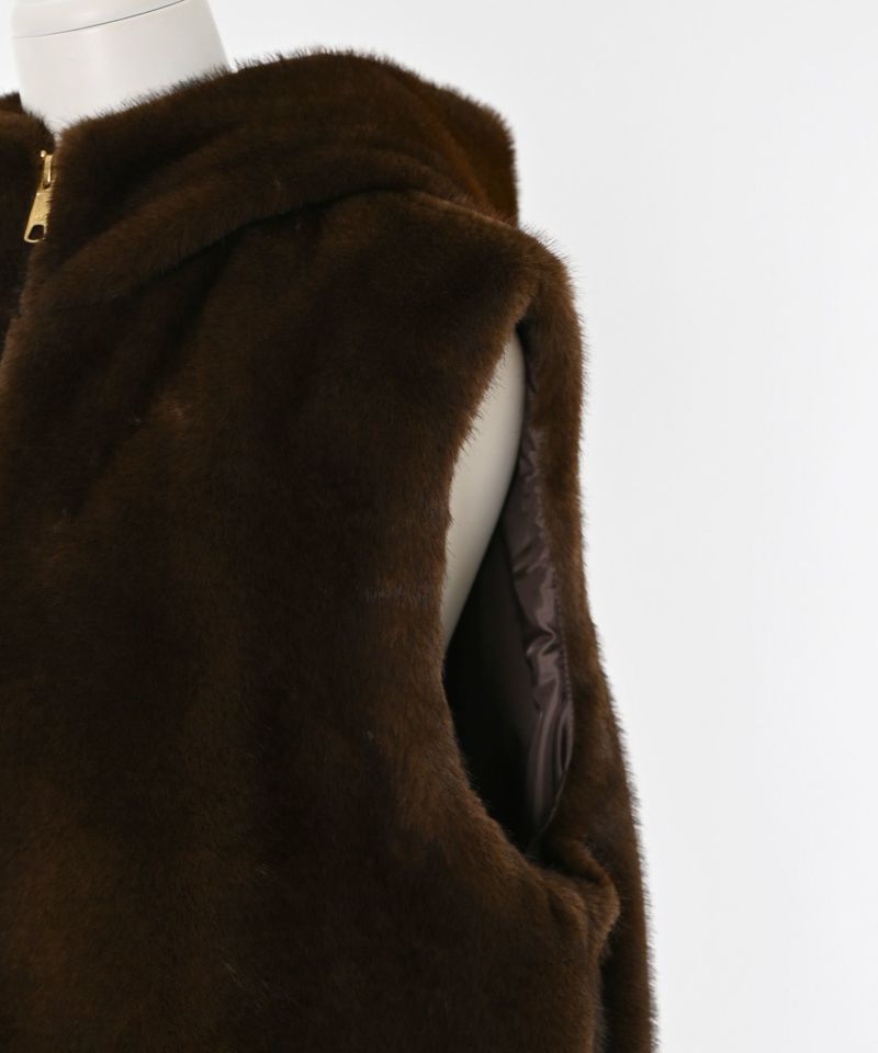 ボリュームのある上品で高級感あふれるエコファーベスト。ブラックにはシルバーカラーをブラウンにはゴールドカラーが配色されたダブルジップデザインがさりげないポイント。顔まわりを包み込むような大きめフードが小顔効果も叶えます。ゆとりのあるサイズ感でアームホールも広めに作られているのでインナーを選ばず着用でき、ハイネック仕様にもなるので防寒性もばっちりです。裾にはドロストコードを採用・深めのポケット付きで実用性も◎