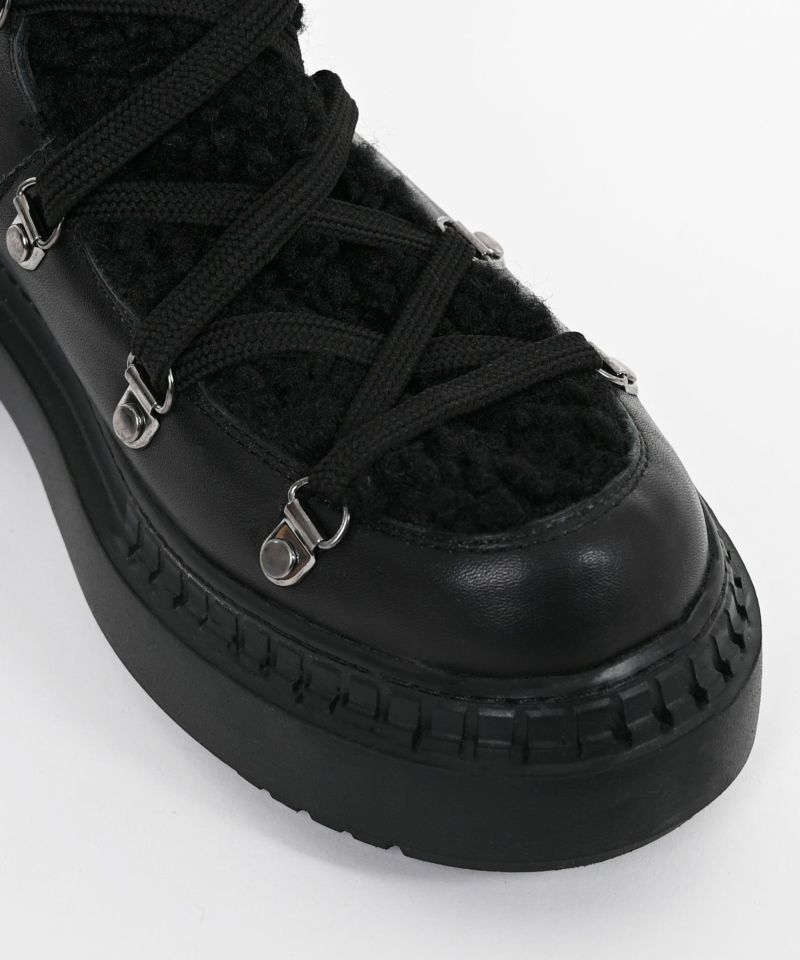 レザーとボアがドッキングされた、甘辛のバランスが絶妙なブーツ。厚みのあるソールと無骨なフォルムが存在感を放ち、足元からスタイルを引き締めます。ボリューム感のあるボアがシーズンムードを高めつつ、暖かさも兼ね備えた機能的なディテール。フロントのシューレースや金具のアクセントがモードな印象をプラスし、どんなコーデにもエッジを効かせてくれる一足です。